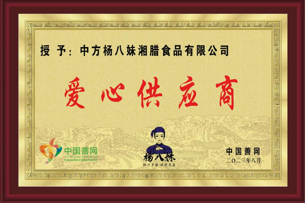 (中国善网授予中方杨八妹湘腊食品有限公司“爱心供应商”荣誉称号)