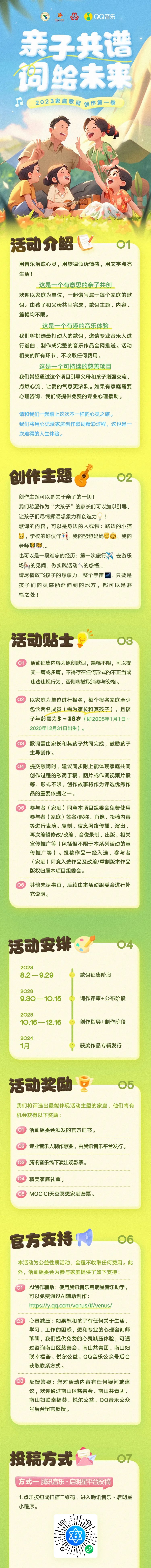 腾讯音乐党委书记、集团副总裁傅鸿城介绍,“亲子共谱,词绘未来”是一个歌词创作公益活动,倡导家长、孩子共同回顾家庭经历,并以其中的难忘时刻作为蓝本创作歌词,让家庭的共同回忆“带上声音”。后续将邀请专业音乐人为优秀的歌词作品谱曲,制作成完整的音乐作品。腾讯音乐高达8亿的用户基础将为音乐作品的传播提供流量支持。作为第一次由互联网音乐平台发布的大型亲子创作活动,腾讯音乐集团十分重视此次活动,不仅组织歌词创作营课程、线上音乐专辑首发、线下音乐会来丰富家长和孩子的参与体验;还将引用AI元素,启动明星音乐助手等辅助创作手段来实现交互式音乐创作体验。