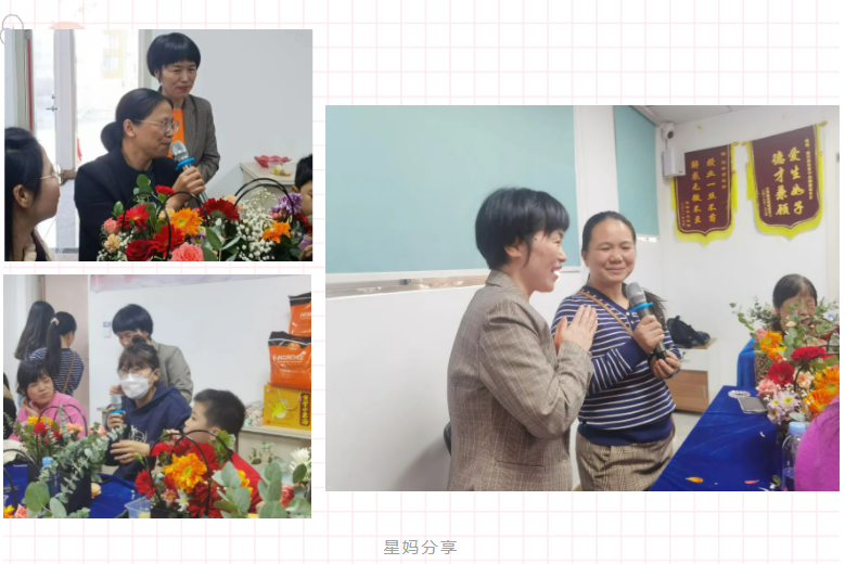 接下来简单的小游戏,星妈们玩得不亦乐乎,有趣的游戏惩罚更是让人笑开怀。游戏结束后,进入活动分享环节。星妈们逐一分享,有说自己学到了一项新技能的,有分享插花心得的,更多的是说着对星孩、对生活的期许的……