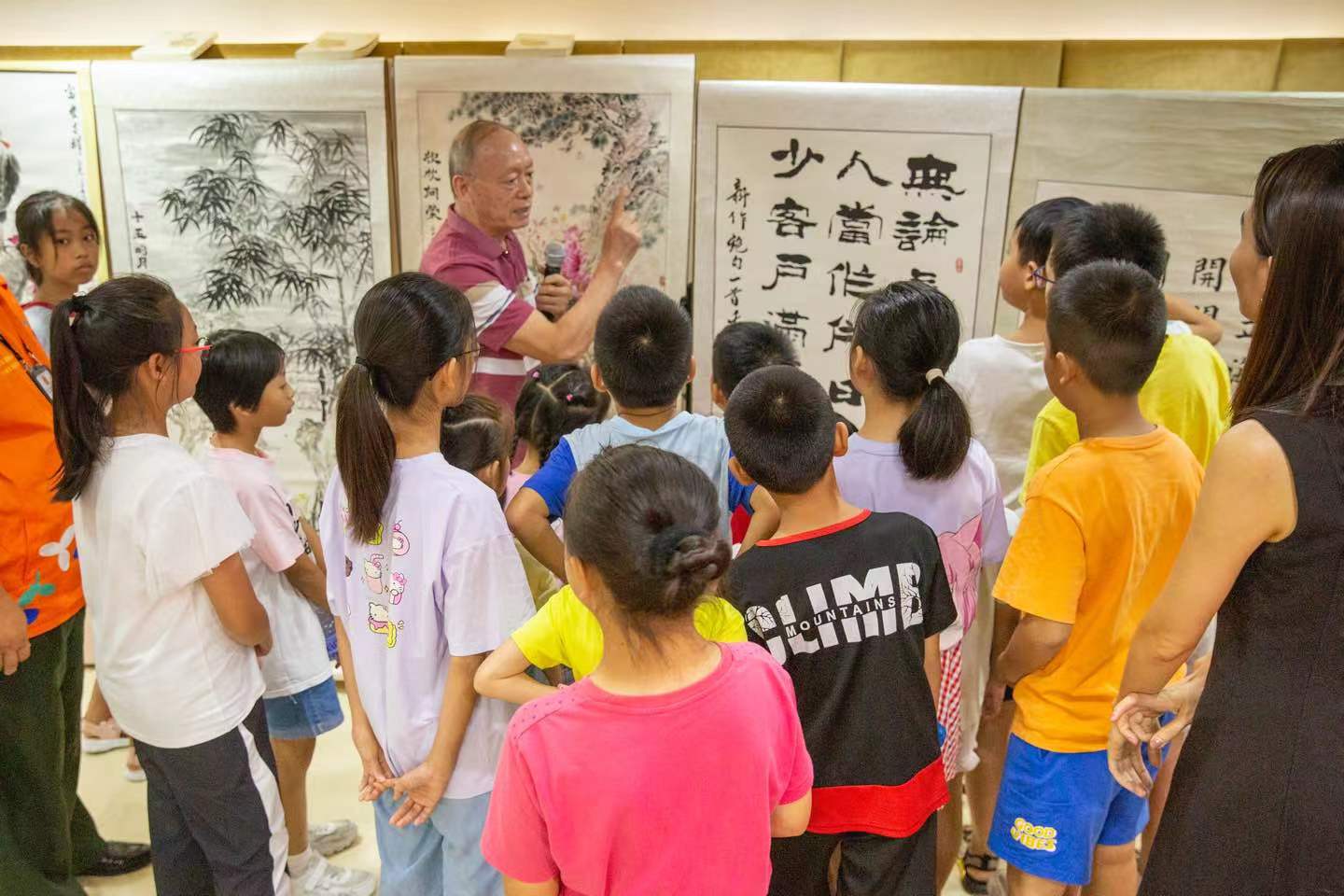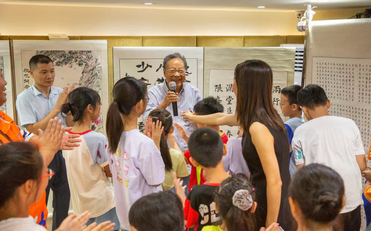活动现场,“五老”通过介绍自己的书画作品,带领孩子们品鉴,表达自己的创作灵感;书法现场教学,“五老”教孩子们正确的书法握笔方式;通过绘画现场教学,教孩子们基本的绘画常识,并在画卷上共创一幅画,描绘童年梦想。