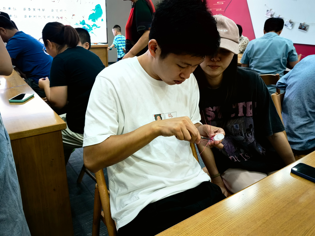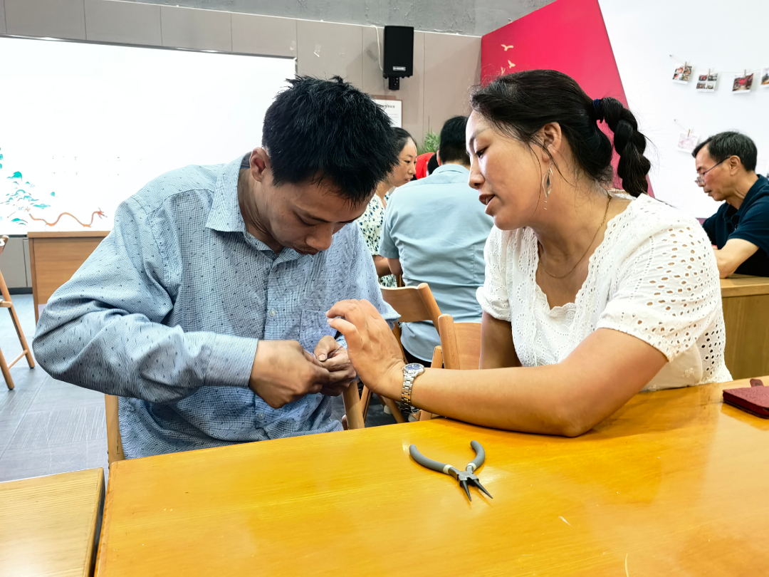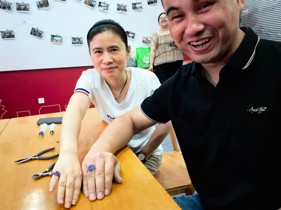活动现场场洋溢着欢声笑语和创作的氛围。大家耐心一起协作解决制作过程中遇到的问题。每个人都全身心地投入到制作戒指的过程中,尽情展现自己的想象力和创意。参与者们用双手将铝丝编织成各种不同样式的戒指,每一枚戒指都独一无二,展现个人的品味和风格。