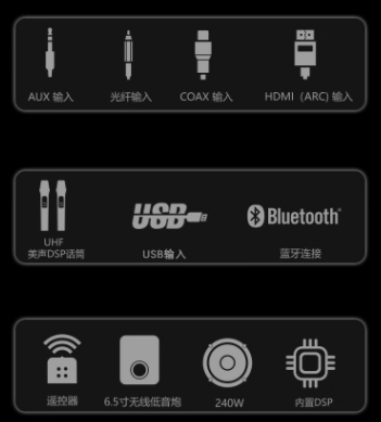 传统的功放机和音箱连接,布线、摆位对于新手小白来说是一件很复杂困难的事情。而瀚宏音响HD-019KW-K、瀚宏音响、019P内置低音一体式回音壁只需要随意摆放或者挂起来就可以啦,还有多种模式(AUX、光纤、COAX、HDMI(ARC)、USB、蓝牙连接)输入(图6),满足不同设备需求。无线低音炮只需插电即可正常连接使用。