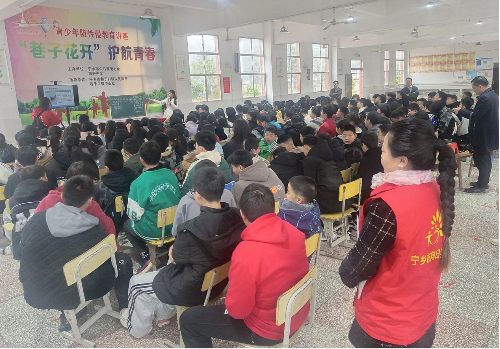 为避免山区青春期孩子因缺乏性安全知识的教育而受到侵害,增强未成年人自我保护能力,保障未成年人身心健康和合法权益,2023年3月20日上午,宁乡市向日葵爱心会“巷子花开 共护成长”关爱互助项目在南轩中学礼堂,组织开展了以“巷子花开” 护航青春 为主题的青少年防性侵教育南轩中学专场宣讲活动,来自巷子口镇南轩中学的180余名儿童参加了讲座。
