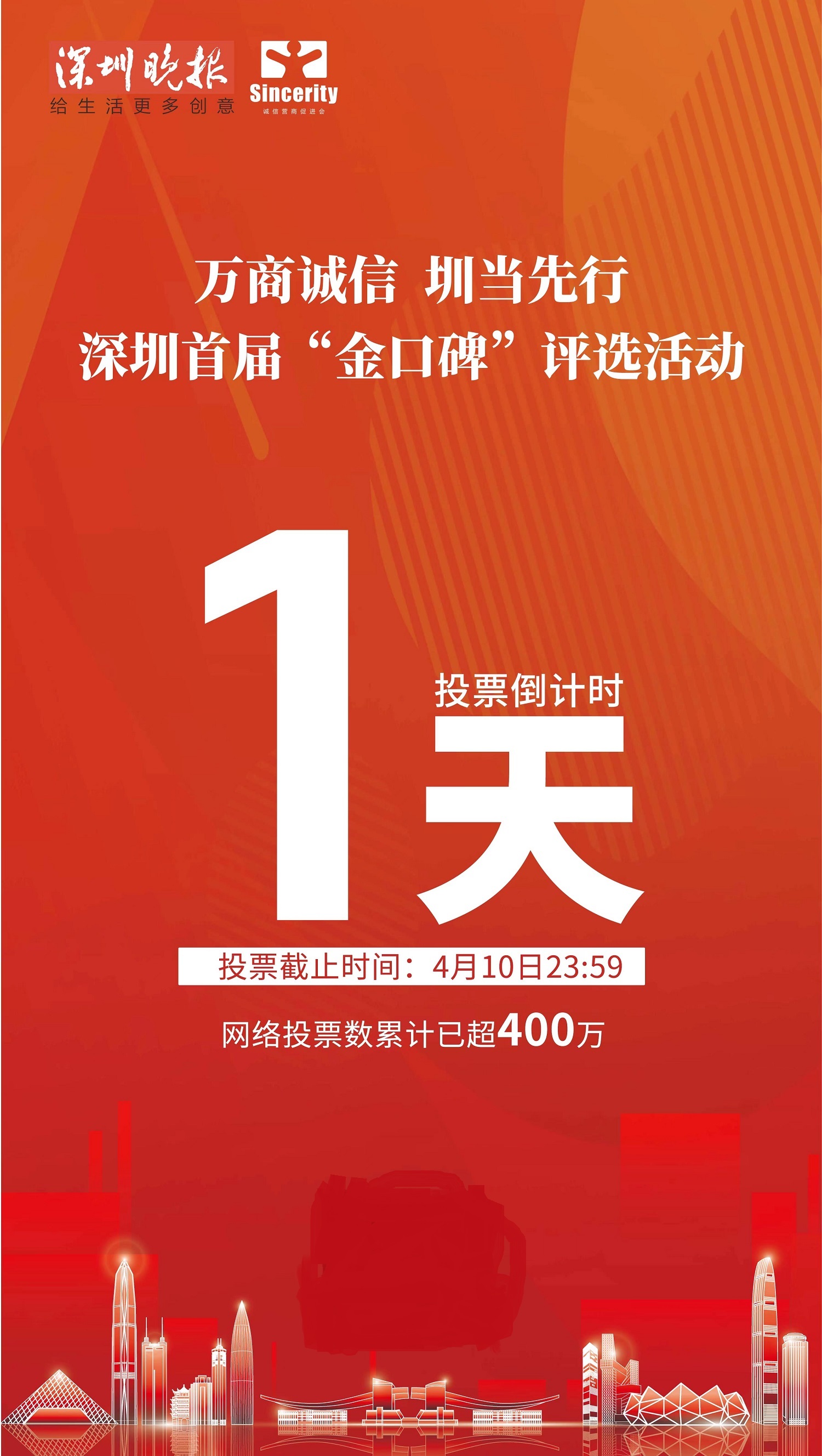 “金口碑”网络投票,通过“深圳晚报”“深圳市诚信营商促进会”微信公众号开展,市民可关注“深圳晚报”官方微信公众号,后台回复“金口碑”,即可参与投票;也可关注“深圳市诚信营商促进会”微信公众号,通过“金口碑奖-海选榜”进行投票。据统计,线上投票截至4月9日,投票人数累计超过400万票,其中企业投票数超过258万票、商户投票数超过151万票。