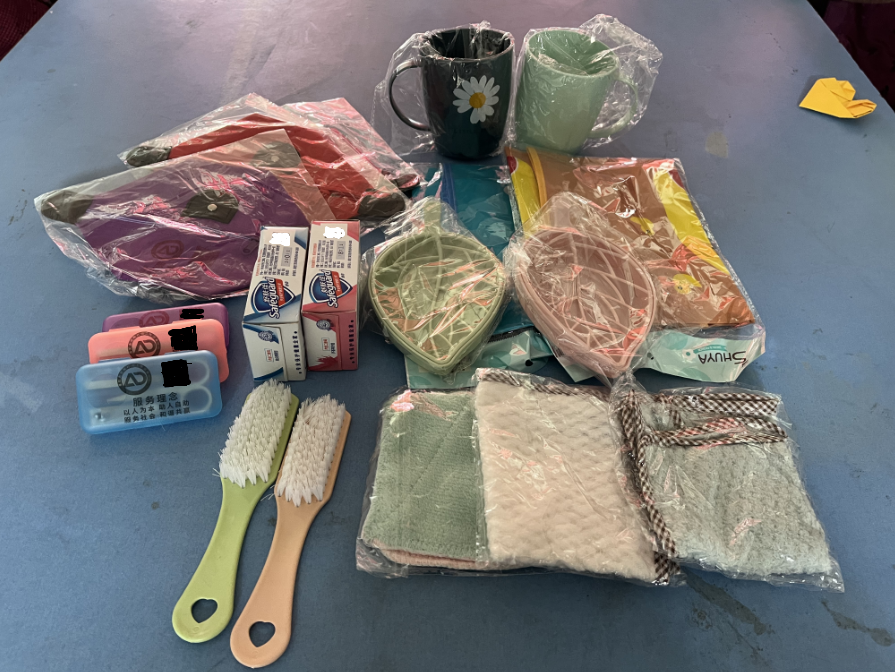 老人们有的眼花耳背的严重,看不清桌上摆放的东西具体形态,社工在一旁耐心回应,为她讲解每一个礼品的用途和用法。