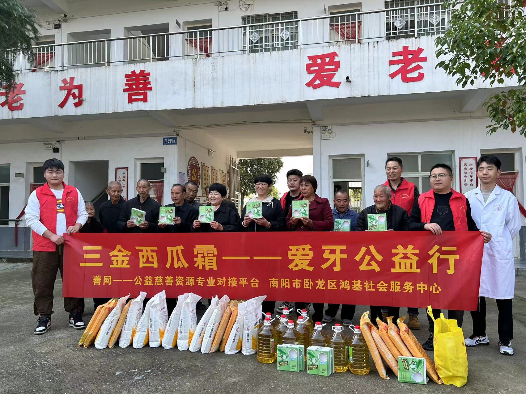 为提升老年人的健康水平、预防口腔疾病,进一步改善居民的生活质量,我中心链接到中国善网平台,2023年10月23日上午,南阳市卧龙区鸿基社会服务中心携手善网在南阳市淅川县九重镇开展了“三金西瓜霜,爱牙公益行”老人口腔健康关爱活动,志愿者们还为老人们送上了由善网—公益慈善资源专业对接平台对接的牙膏和祝福。