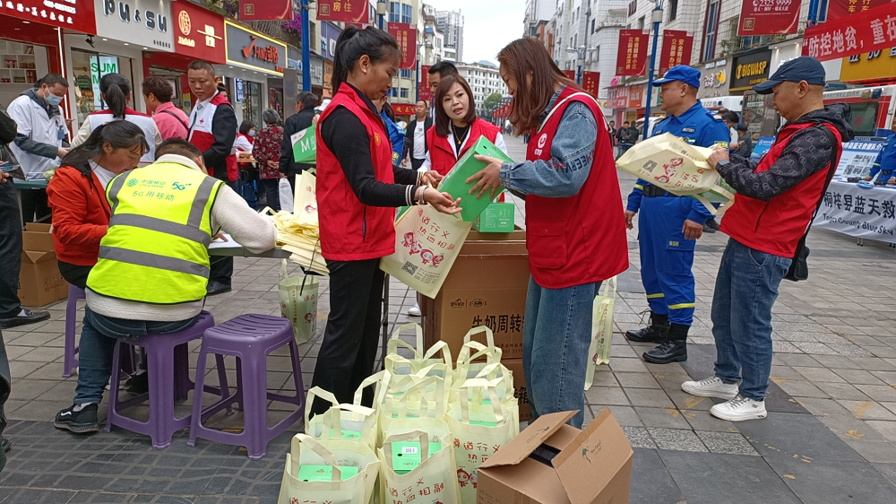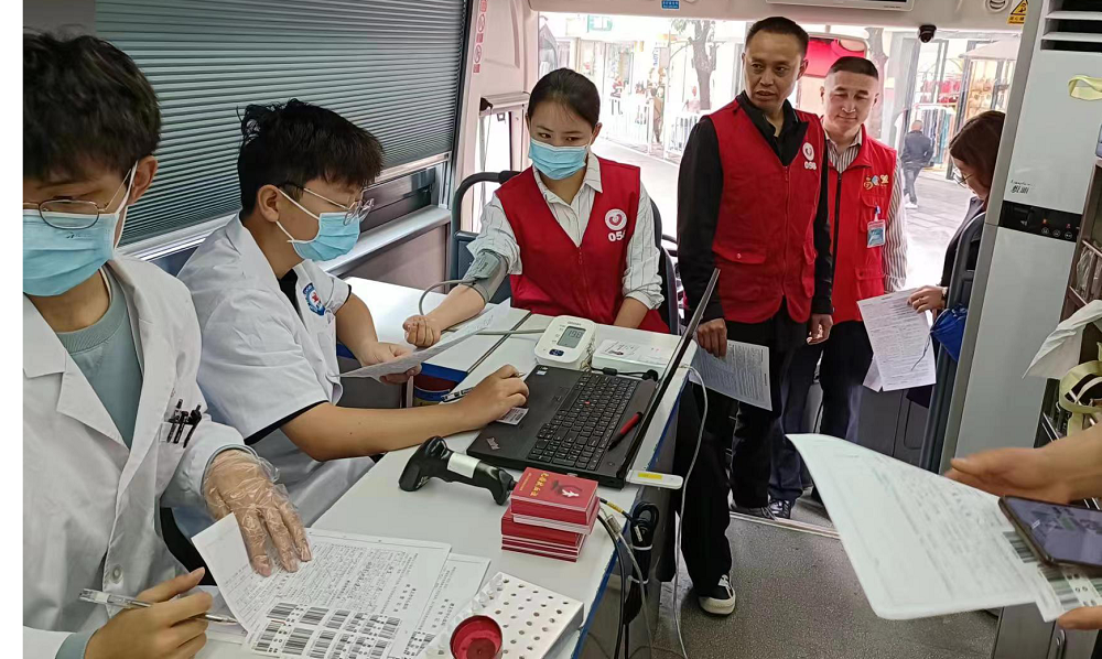 5月8日,春晖志愿者和蓝天救援志愿者们早早来到步行街,与县红会、县直医疗机构人员一起搬运物品、设置宣传台,为市民提供医疗健康检查(测血压、血糖)、医疗健康咨询、无偿献血知识宣传等,向市民群众宣传“三献”(无偿献血、造血干细胞、遗体、人体器官捐献)知识,耐心接受解答市民群众的咨询、现场答疑解惑。不一会,遵义市中心血站的流动采血车开到了桐梓县步行街口,志愿者们积极配合工作人员布置采血登记台、物品摆放、悬挂无偿献血宣传横幅等。在活动现场,志愿者们协助工作人员积极参与到无偿献血及造血干细胞采集的后勤服务保障中,参与维护现场秩序、献血引导、宣传无偿献血知识、张贴采集试管条形码等,还主动为献血者们递上一杯热水,宣传和引导他们不要紧张,放松心情接受采血,宣传告知献血知识和注意事项等;献血者在志愿者的指引下,有序排队,依次完成了信息登记、血液类型检验、健康初检、静脉采血等献血环节的后勤服务保障工作。整个献血活动有89人现场填表登记体检,体检合格成功献血42人,共计捐献全血14200ml,有16人完成了造血干细胞血样采集信息登记。