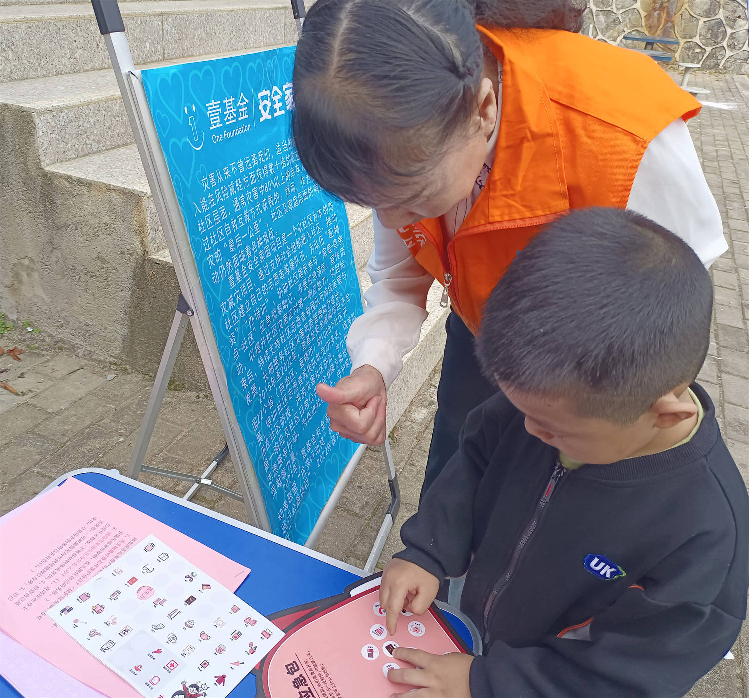 “发生灾害时,我们必须快速前往一个更安全的地方。可能没有时间打包需要的物品,因此提前准备好应急包非常重要……”家庭是最基础的社会单元,灾前有效的减灾措施,可极大减轻灾害给家庭带来的负面影响。为此,志愿者利用家庭安全教学包向儿童发放物品贴纸和背包卡纸,引导小朋友动手制作家庭安全应急包,准备好三天的应急物资,以应对地震等突发情况。志愿者耐心解释应急包物品的必要性和注意事项,鼓励更多居民准备家庭安全应急包,在安全撤离时需遵循“不要讲话、不要奔跑、不要推挤、不要返回”四原则。