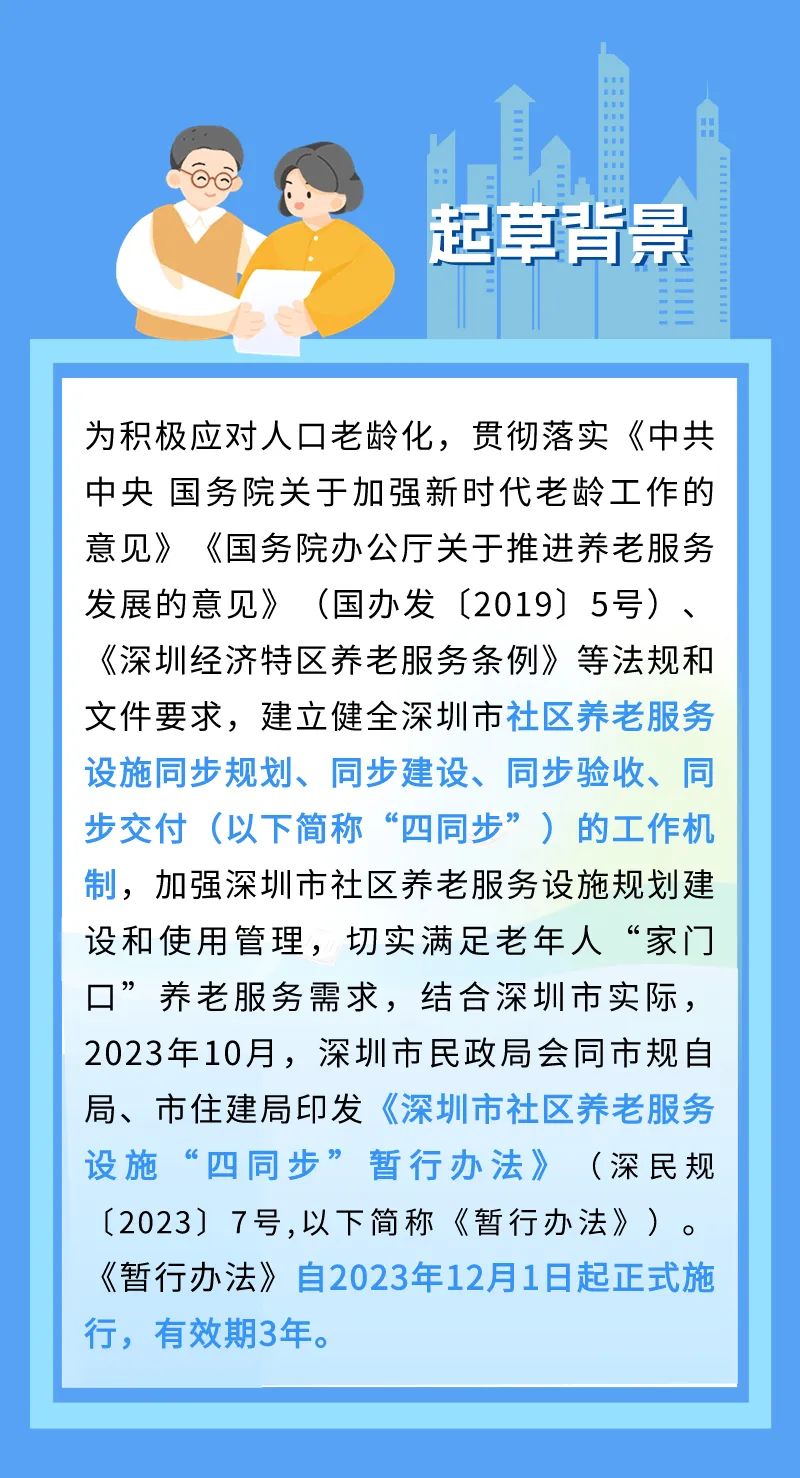 近日,深圳市民政局会同深圳市规划和自然资源局、深圳市住房和建设局印发《深圳市社区养老服务设施“四同步”暂行办法》(深民规〔2023〕7号,以下简称《暂行办法》)。《暂行办法》自2023年12月1日起正式施行,有效期3年。