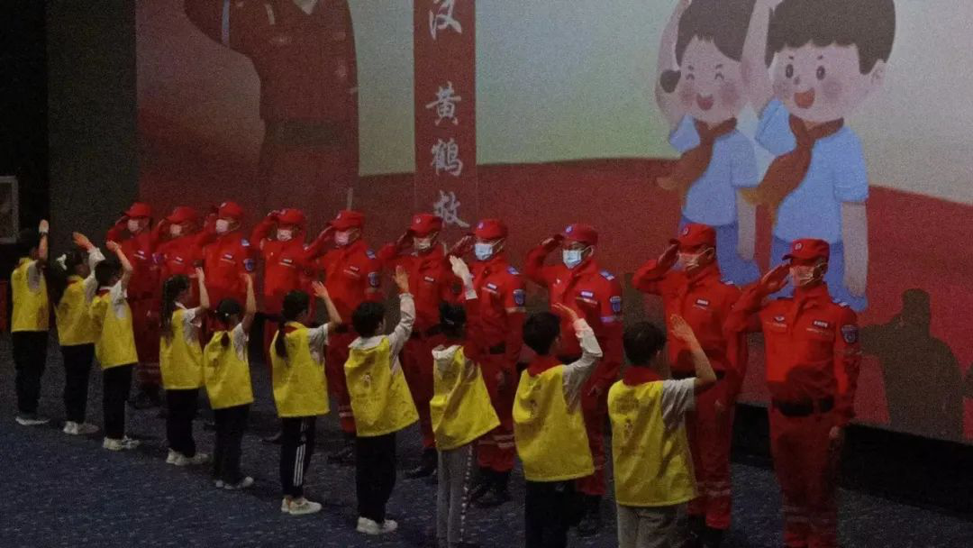 敬少先队员礼,为武汉市黄鹤应急救援队队员系上红领巾,公益小天使郑钰祺、陈芷钰、杨佳妮和身边的小朋友们分享着,神情中抑制不住的兴奋!这是发生在5月7日下午,由金逸影城凯德广场店定向邀请的公益观影活动现场的一幕。