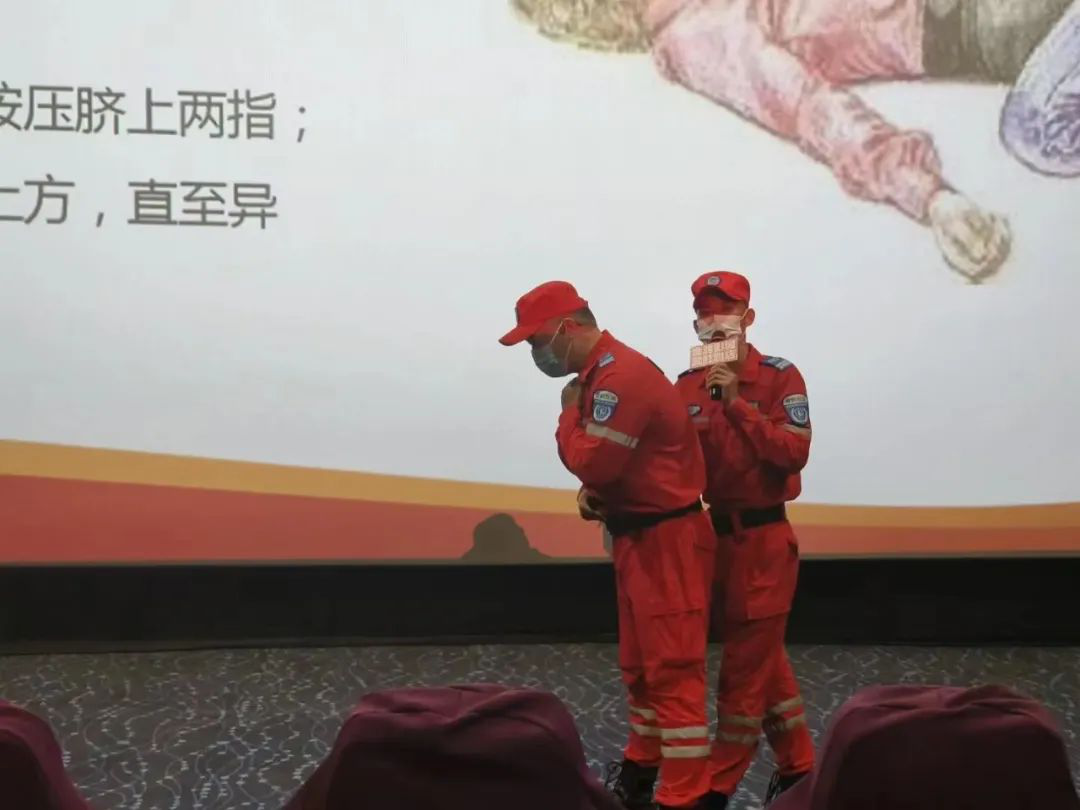 随后,应急安全推广师师资、中国红十字会救护师资、全国首期少年急救官的认证讲师、黄鹤救援队张泽彦向在场的200多人讲解了海姆立克急救法。这也是张泽彦第一次在影院里进行应急科普,与他合作的是今年3月,在武汉市应急局组织的全市应急管理科普讲解赛上,唯一的一等奖获得者、黄鹤救援队陈皓。