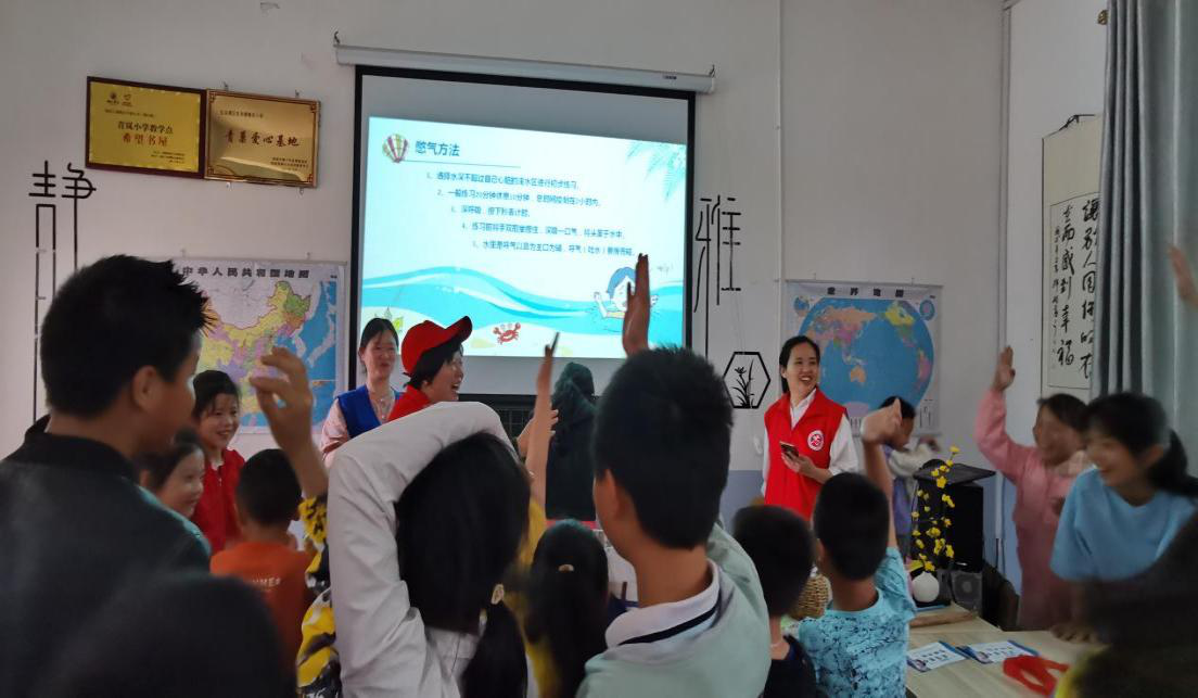 活动现场宣讲老师采用重点知识讲解、现场提问互动、打结演练,志愿者帮教、憋气PK、心肺复苏演练等形式帮助同学们学习防溺水和急救知识。同学们非常活泼,回答问题积极举手发言,刚开始的时候有部分小朋友较内向,慢热,经过几轮的互动之后也被带动起来,勇敢的参与到活动中来。