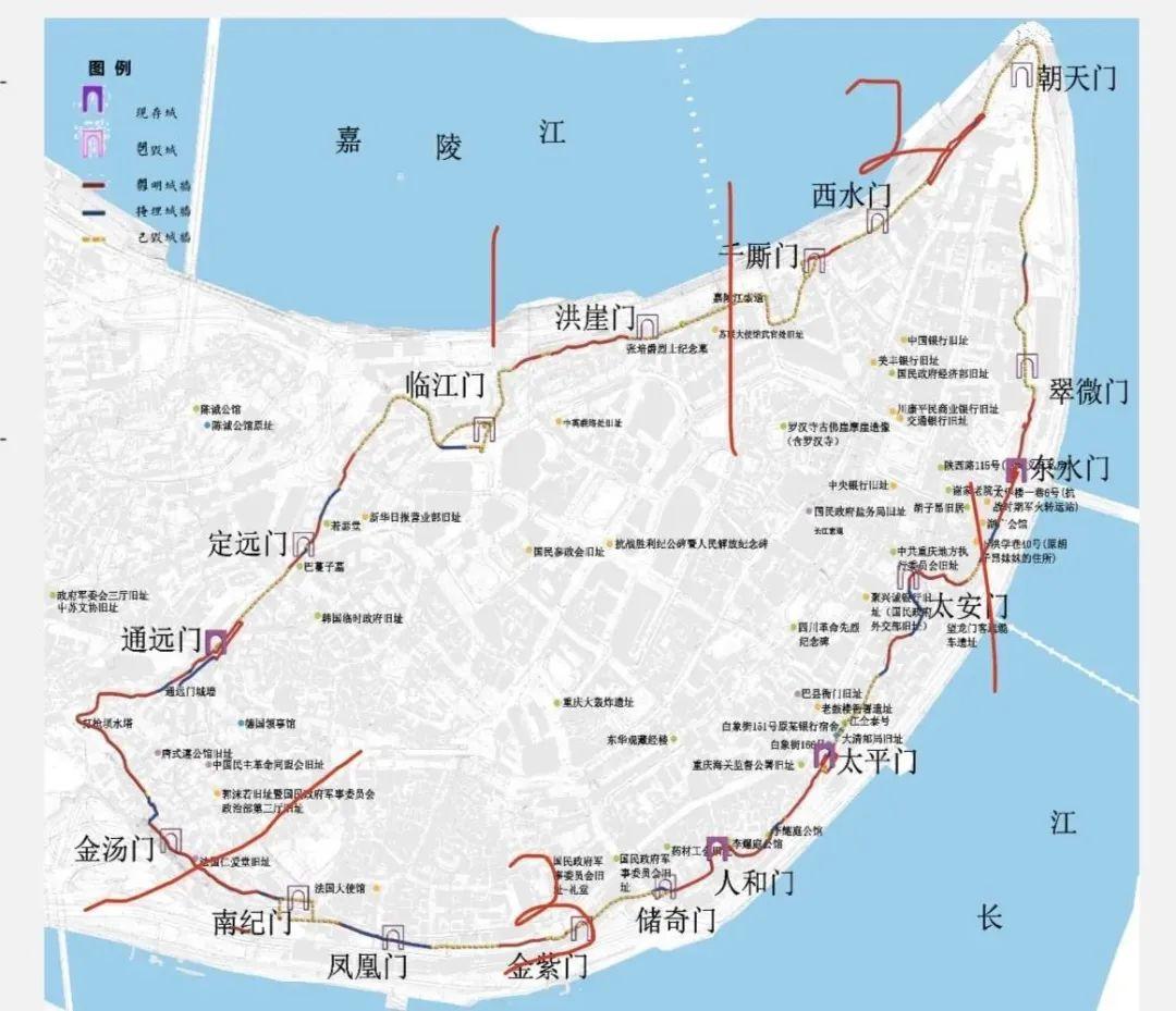 经前期调研,目前有以下几点共同需注意问题:1、主城区各组界面如图,1-2组界面在沧白路南国景丽分段,2-3组在望龙门缆车遗址分段,3-1组在山城巷60号分段;2、城墙为城门两侧中段,起止方向以顺时针方向;3、目前重庆城墙有明露,掩没,叠压,硬化封护,植被遮挡几种状况,还有城墙的衍生区域和附属物等,巡查测量时要留意,尽量分辨;4、重庆城墙自古来,多位于山脊,外高内低,临江之处多为峭壁或陡坡,加之近年建设多,工地多,切实注意安全第一,防坠防小动物伤人;5、数据如果是软件测的,最好多人多次测了取个平均值,维持数据的准确性与稳定性;6、江北城城门残余保定、东升、问津三门,资料不多,现场勘查数据更应多、准;7、枇杷山书院有方志,空了各位可去查阅,特别是资料组的。8、调研在5月底6月初完成