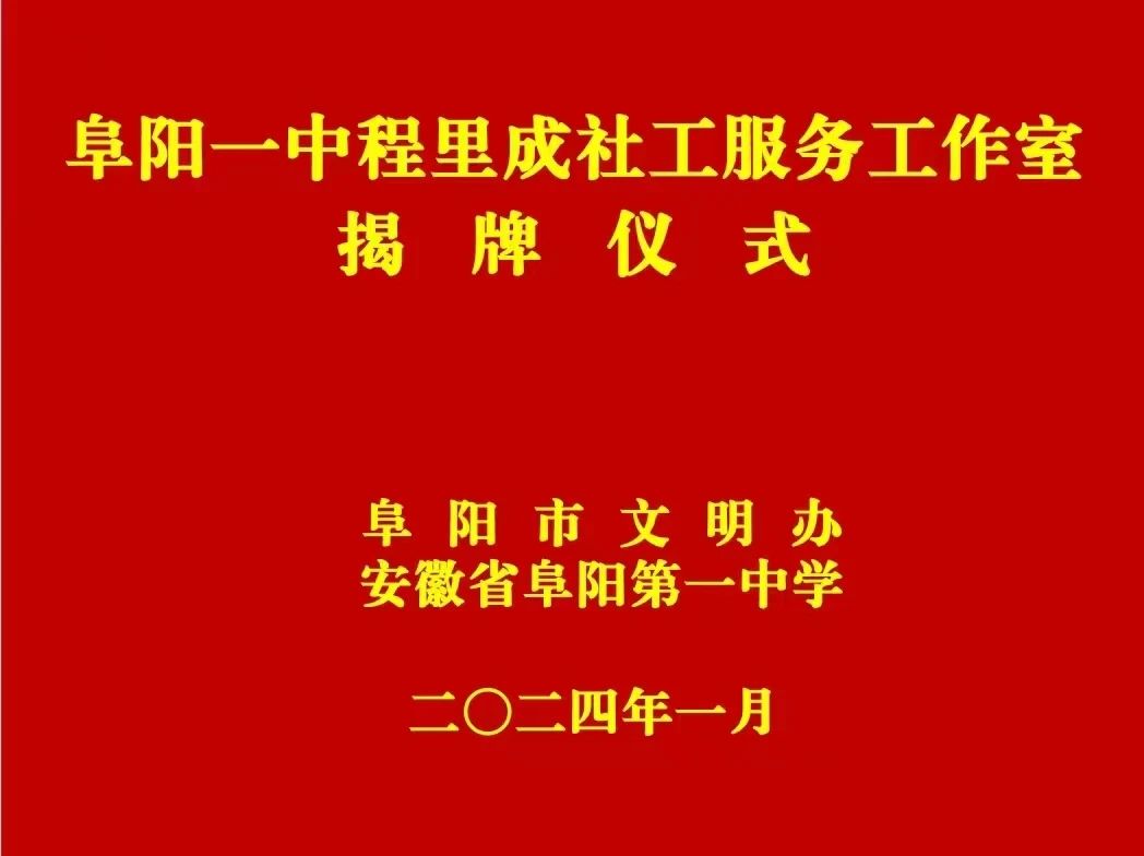 2024年1月4日,阜阳一中程里成社工服务工作室揭牌仪式在安徽省阜阳第一中学举行,市文明办副主任张燕、阜阳一中副校长刘凤君、市文明办三级主任科员韦泽宇、阜阳一中程里成社工服务工作室负责人程里成、阜阳一中团委副书记王晓曼、阜阳一中政教处副主任卢洪传、颍州晚报记者任刚、阜阳市心公益社会工作服务中心副理事长韩叶飞参加活动,活动由阜阳一中资助办赵士龙主持。
