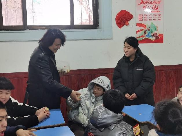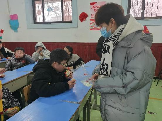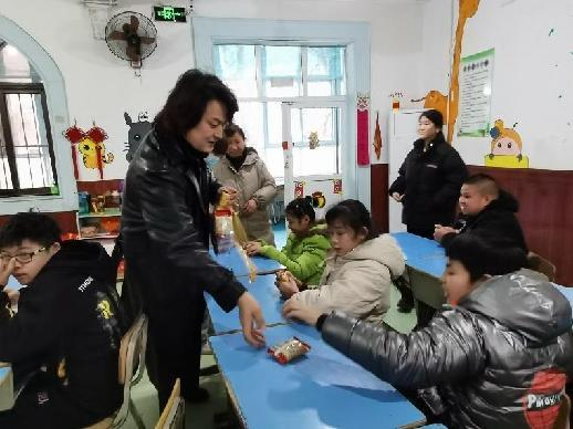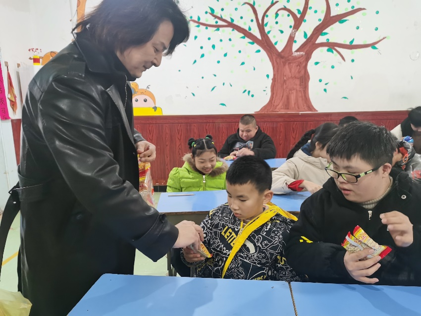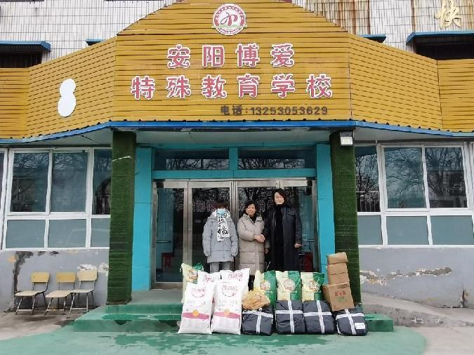 2023年1月15日下午,安阳市大千书画的负责人高院长携女儿来到安阳博爱特校,为学校的师生送来了米、面、油和纸尿裤等物资,为特校送来了温暖。高院长和女儿还来到班级中看望每一个孩子,给孩子们分发小零食,和孩子们聊近况。程吉祥看到高院长很激动,开心地介绍自己,为高院长带来了一段新闻播报,高老师边听边鼓励程吉祥,夸他很厉害。