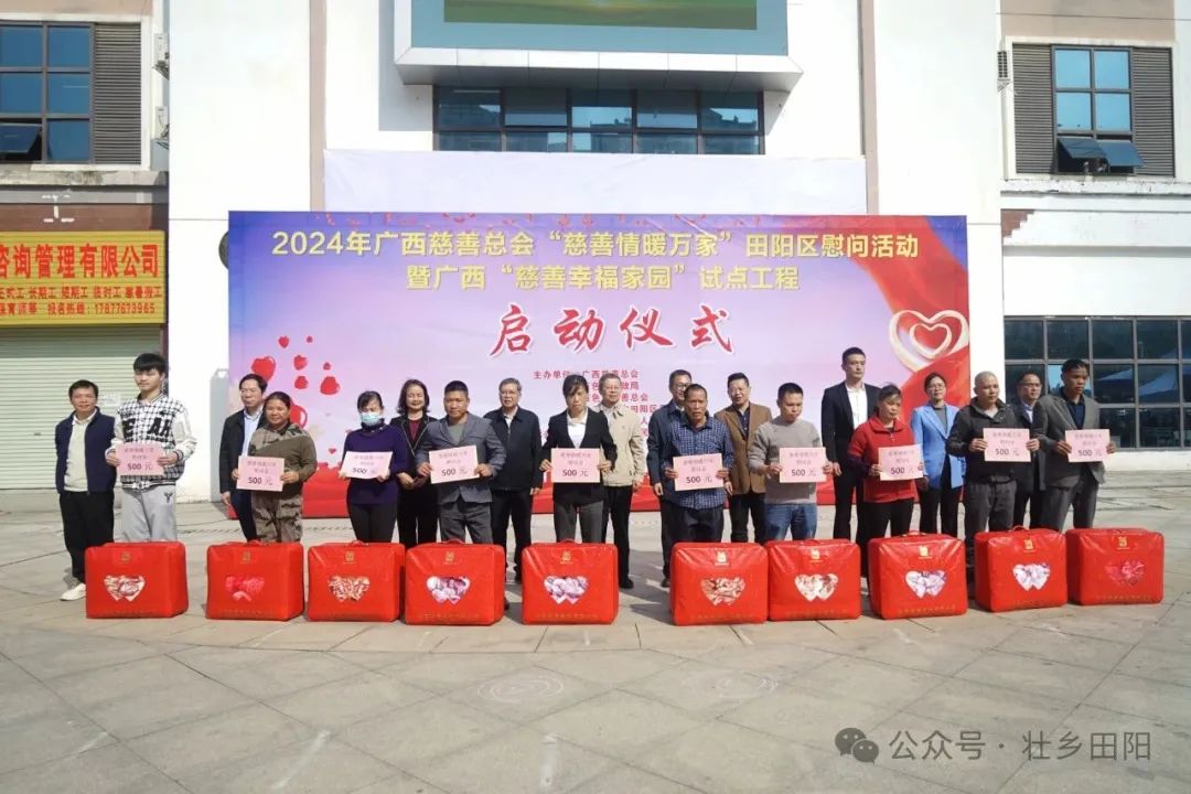 启动仪式上,刘正东代表广西慈善总会向百色市田阳区捐赠“慈善情暖万家”慰问金和“慈善幸福家园”配捐资金 万元,谢贞君代表百色市田阳区接受捐赠。广西扬翔股份有限公司、广西明天慈善基金会和爱心人士分别向广西慈善总会捐赠善款。参加活动的领导和嘉宾分别向居住在老乡家园五指山社区的 位受助困难群众代表现场发放慰问金、慰问品。