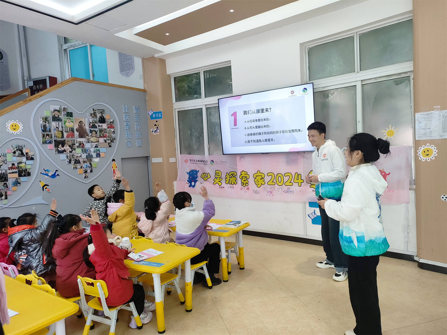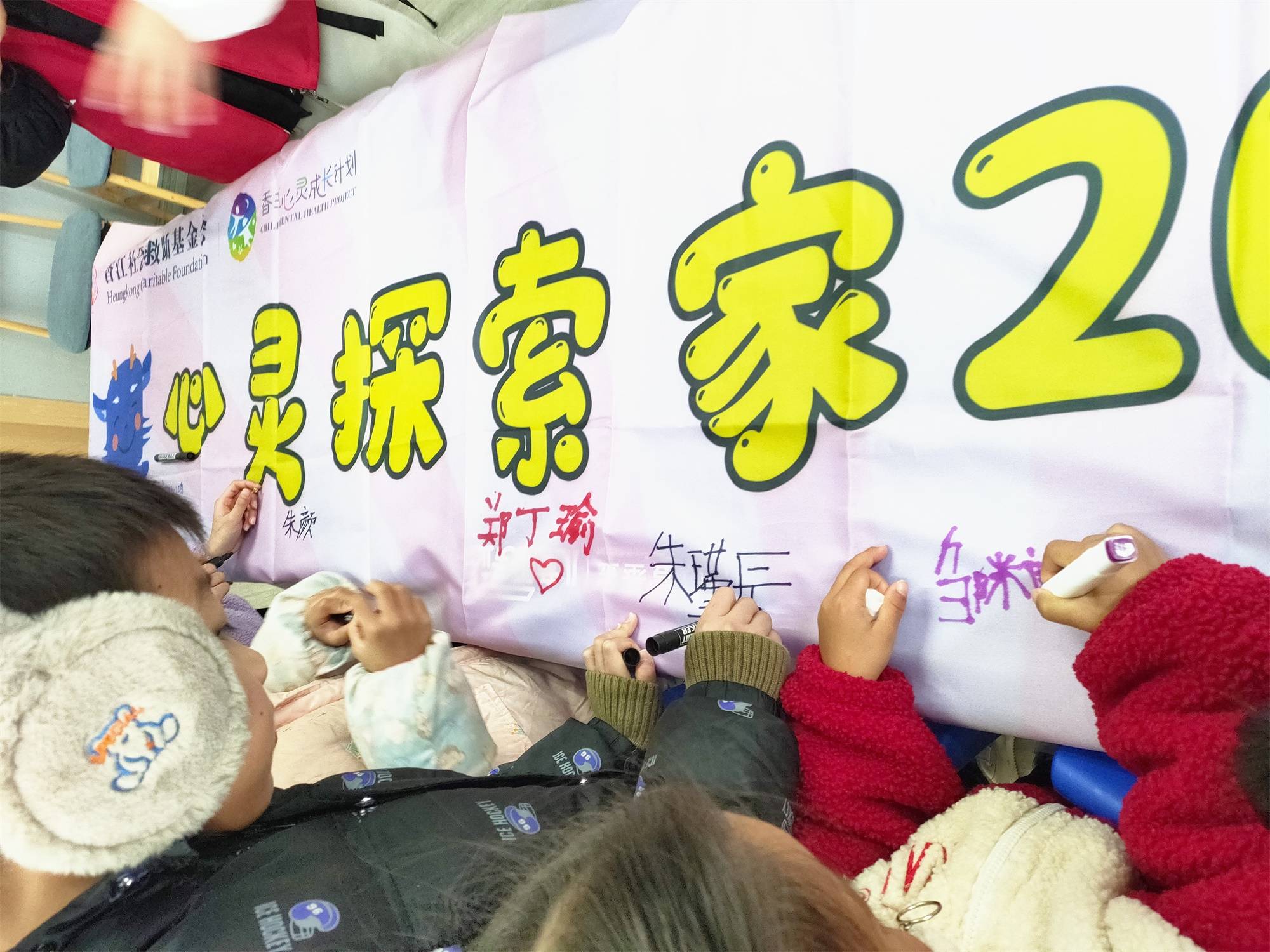 活动开始,志愿者以玩游戏的方式与小朋友拉近距离相互认识,并介绍心理探索家2024冬令营活动的课程内容、课程时间和注意事项等,并在活动横幅上签上自己的名字,甚至画上小爱心以示喜欢。
