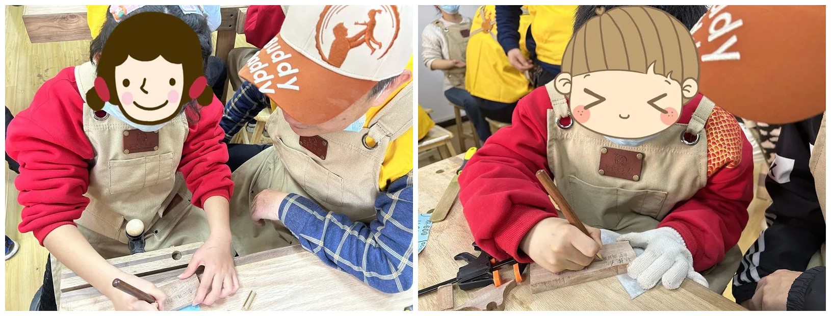 随着活动的推进,张老师开始了本期活动“党徽笔架”制作材料的介绍,虽然孩子们和自己的伙伴都是第一次见面,但是 在动手这件事情上却有着特别的默契,分工合作,完美配合。对于使用到的工具,也能快速掌握使用方法,一锯一打磨配合的刚刚好。