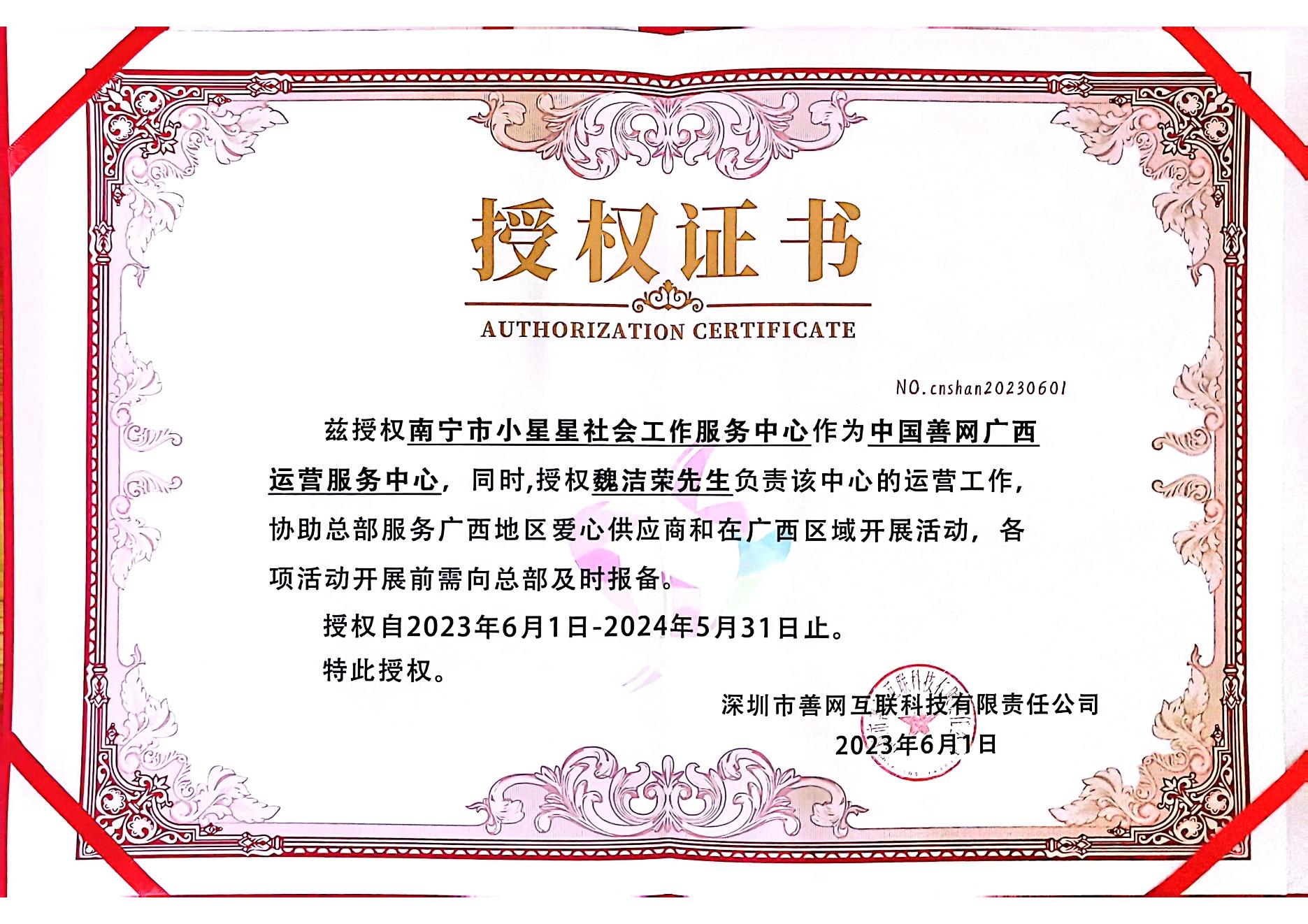 2023年“六一”儿童节关爱“小星星”公益联欢会活动在南宁举办,届时中国善网广西运营服务中心正式揭牌,出席此次揭牌仪式的代表有中国善网COO王刚、本次公益活动的总协调人、小星星关爱联盟发起人、南宁市儿童康复行业协会会党支部书记、会长魏洁荣。此次揭牌仪式圆满完成,标志着中国善网首家挂牌运营服务中心正式成立。