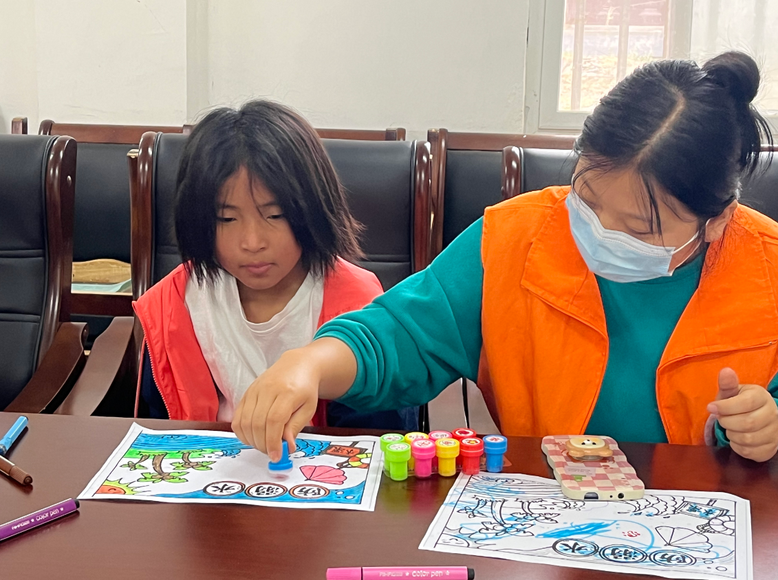 小朋友们依次完成了绘画,社工姐姐给小朋友们的画报盖上了“优秀”的红章。