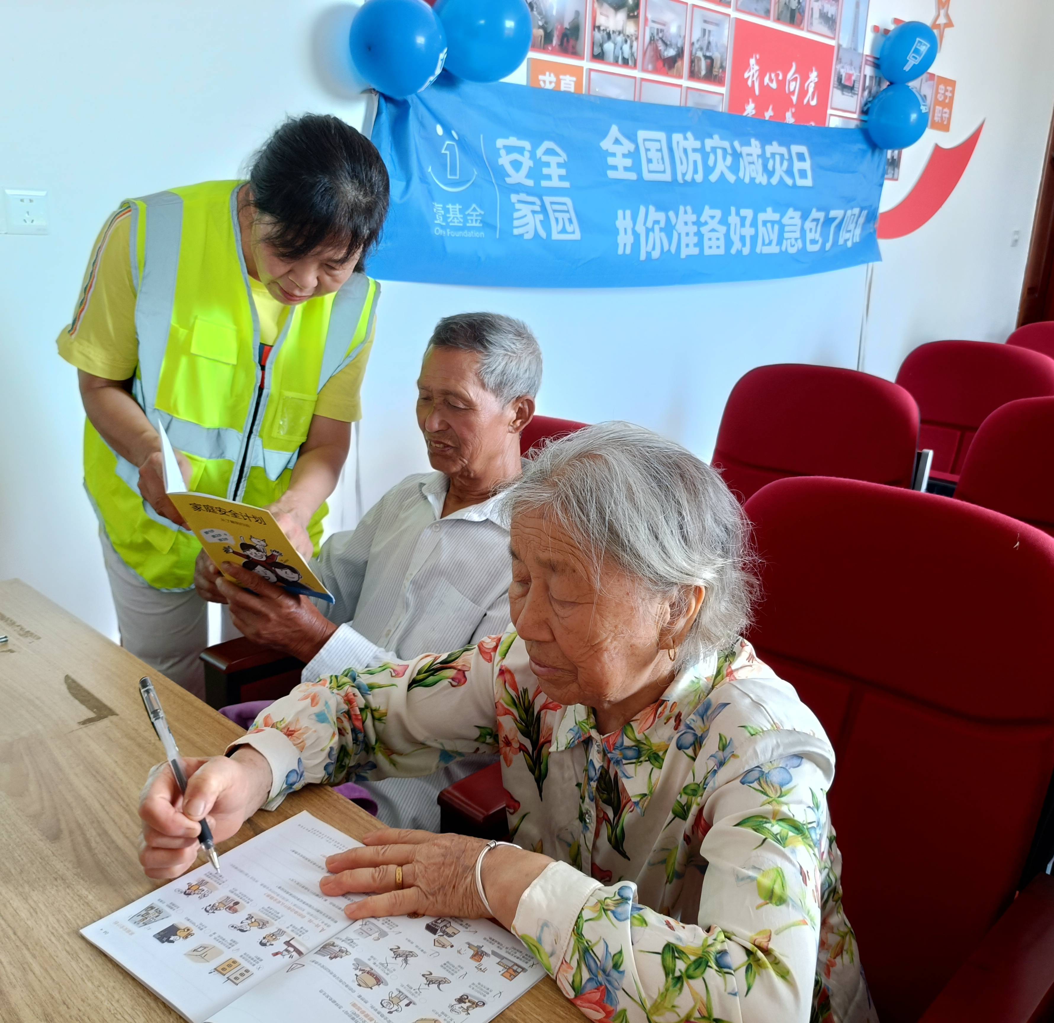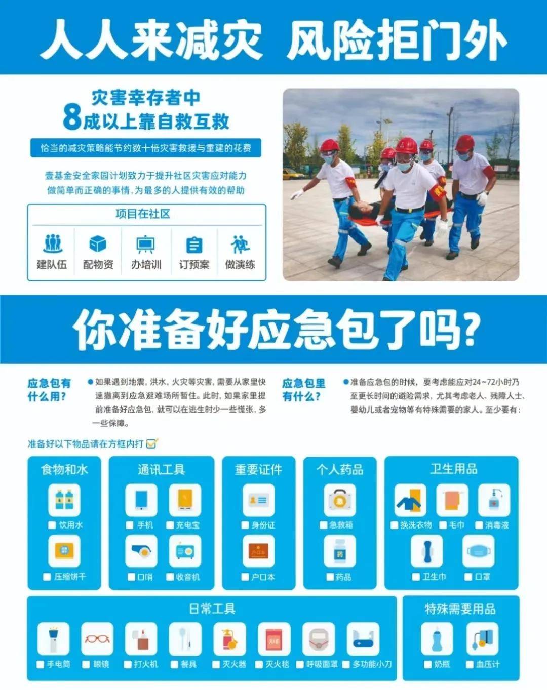 “你家准备应急包了吗?”“应急包是每个家庭、单位、个人都应该准备的。对可能发生的意外、突发事件、灾害提早做一点准备,不仅可以降低人们面对灾害时的脆弱性,减少灾害损失,甚至在关键时刻还可以有效保障生命安全。”志愿者向居民们科普了家庭应急包应该包含哪些基本物品,如食品、水、急救用品、通讯工具等,并强调了应急包在地震、火灾等突发事件中的重要作用;志愿者还结合各领域灾害风险特点,向现场群众普及在地震、洪水、台风等自然灾害事故发生时的防灾减灾和避险自救知识,以及电梯安全、家庭燃气与用电安全等居家防范常识,家庭安全计划、《你准备好应急包了吗?》等图文并茂的宣传资料,以及接受了现场群众咨询等,切实帮助村民尤其是老年村民准确分辨、及时规避身边风险。