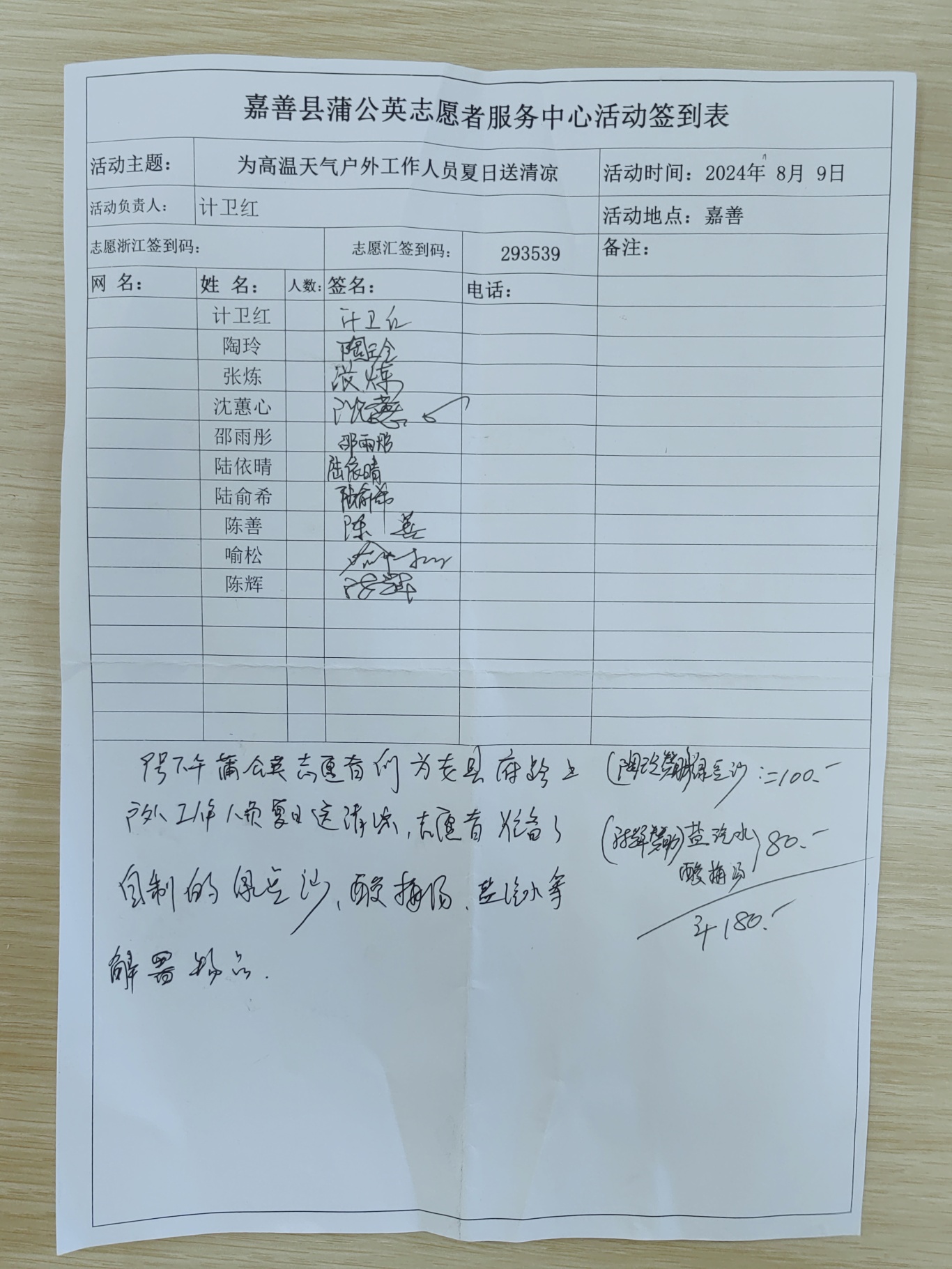 8 月 9 日下午,嘉善县蒲公英志愿者服务中心的当月活动负责人计卫红精心组织安排了这次送清凉活动。在活动筹备阶段,计卫红积极协调各方资源,确保活动能够顺利开展。她认真策划活动流程,细致地考虑每一个环节,从物资的准备到人员的分工,都安排得井井有条。计卫红深知这次活动的重要性,她希望通过自己的努力,为高温下的户外工作人员送去一份实实在在的关爱。