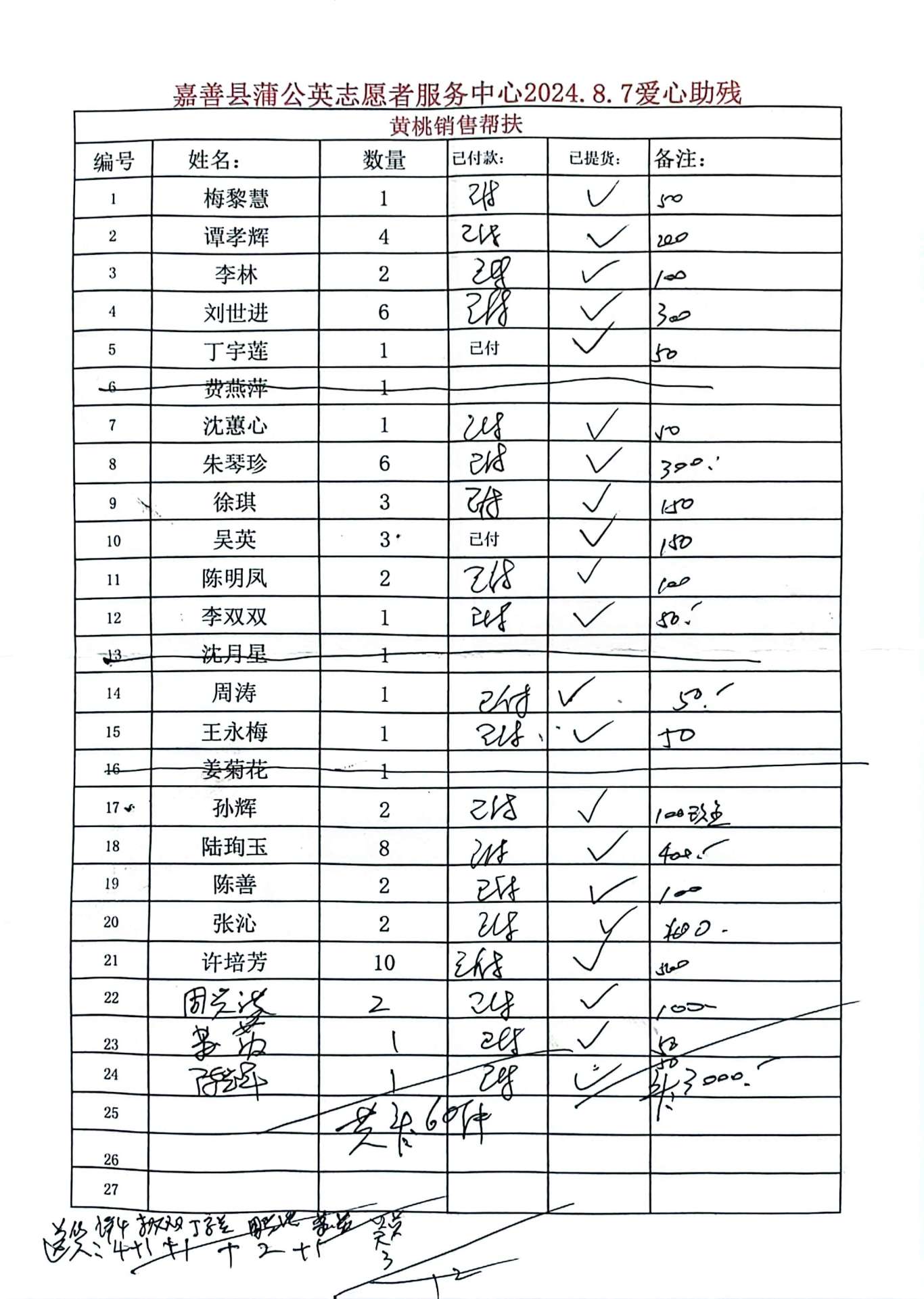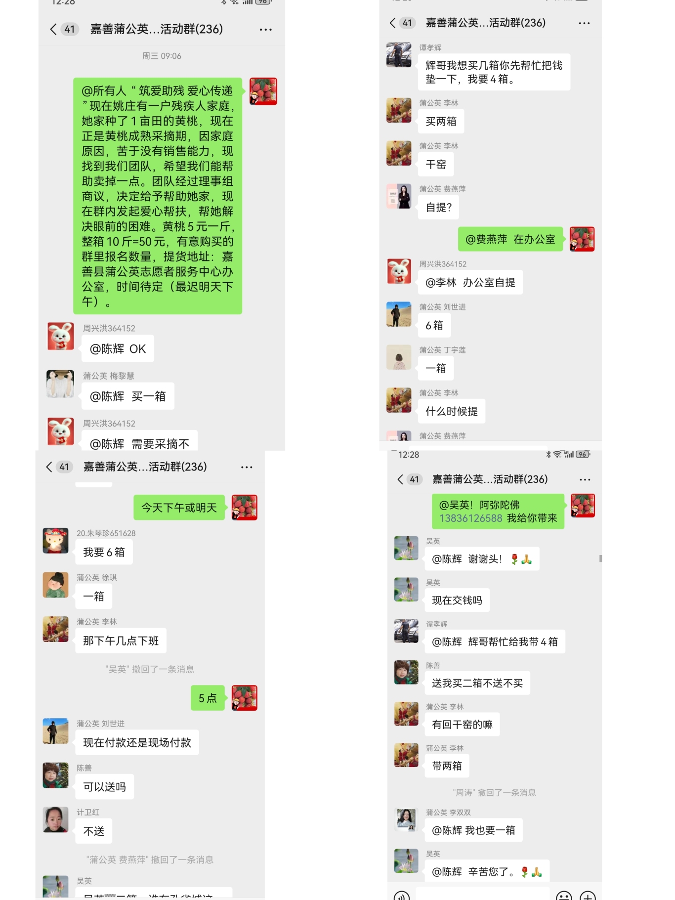 8月7日,嘉善县蒲公英志愿者服务中心负责人得知了这户家庭的困境后,迅速行动起来。组织了一场以“筑爱助残”为主题的活动,决定帮助这个家庭销售黄桃。志愿者们纷纷发挥自己的力量,通过各种渠道宣传推广,联系买家。