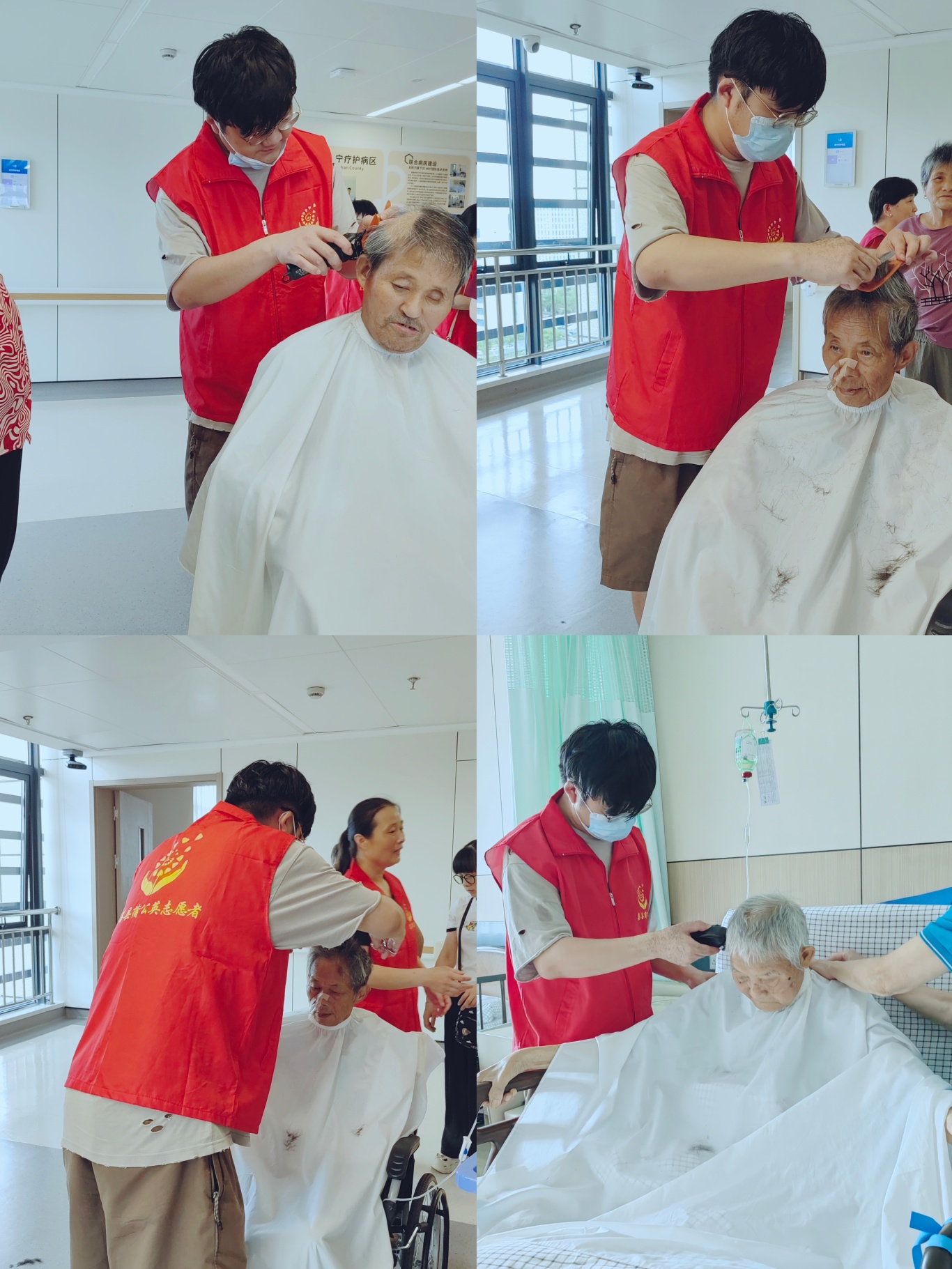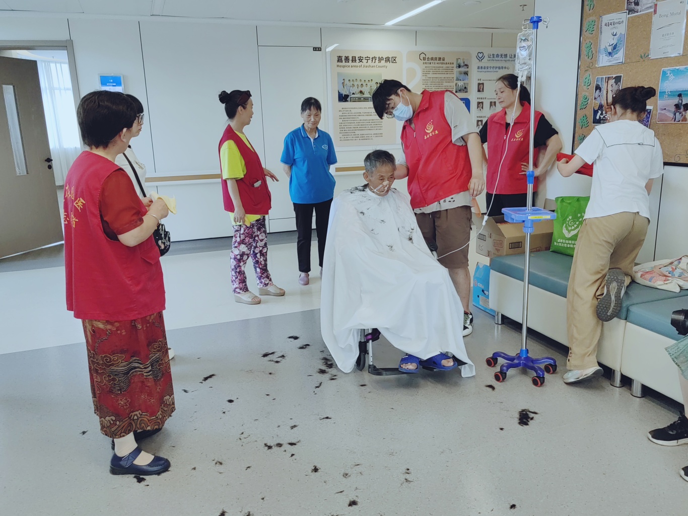 志愿者们集合后来到嘉善县安宁疗护病区,他们的眼神中充满了关切和热情。老人们有的陆续坐着轮椅由家人陪伴着来到理发区,嘉善彼得型美发厅的志愿者潘师傅动作轻柔地为他们梳理头发,耐心询问着老人对于发型的要求。剪刀在手中飞舞,银丝纷纷飘落,老人们的面容逐渐变得清爽整洁。不能下床前来的老人由理发师来到病床边为他们进行理发,细致周到的服务让老人们很是开心。