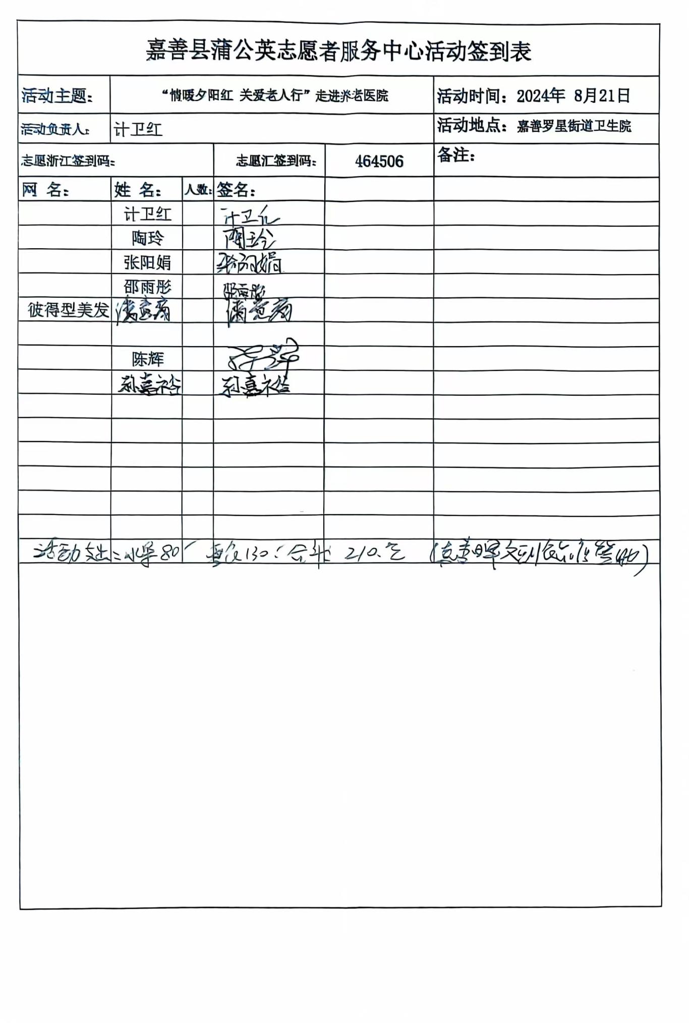 8 月的阳光依旧炽热,嘉善县蒲公英志愿者服务中心的当月活动负责人计卫红却早已忙碌起来。她精心策划,细心安排,只为了给罗星街道卫生院安宁疗护病区的老人们带来一次难忘的关爱之旅。她联系理发师志愿者、准备物资、每一个细节都考虑周到。在她的努力下,志愿者们纷纷响应,怀着满满的爱心,期待着活动的到来。