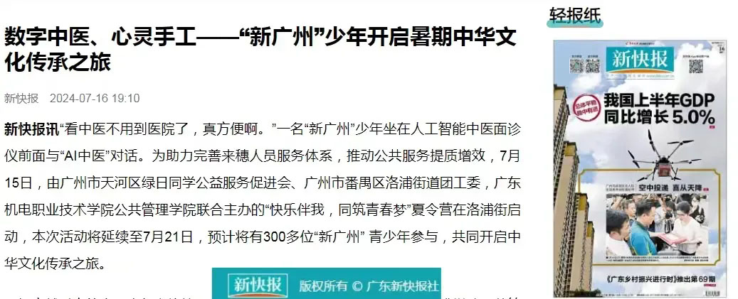 本次夏令营还获得省级媒体“新快报”的支持,以“数字中医、心灵手工——“新广州”少年开启暑期中华文化传承之旅”为题进行了报道。这不仅展示了我们团队的凝聚力和执行力,也体现了我们对社会责任的深刻理解与积极践行。我们深感荣幸,能够通过这样的活动,向社会传递正能量,激发更多年轻人的激情和梦想。未来,我们将继续致力于组织更多有意义的活动,为青少年的成长提供支持和平台,同时,也期待社会各界的持续关注和支持。