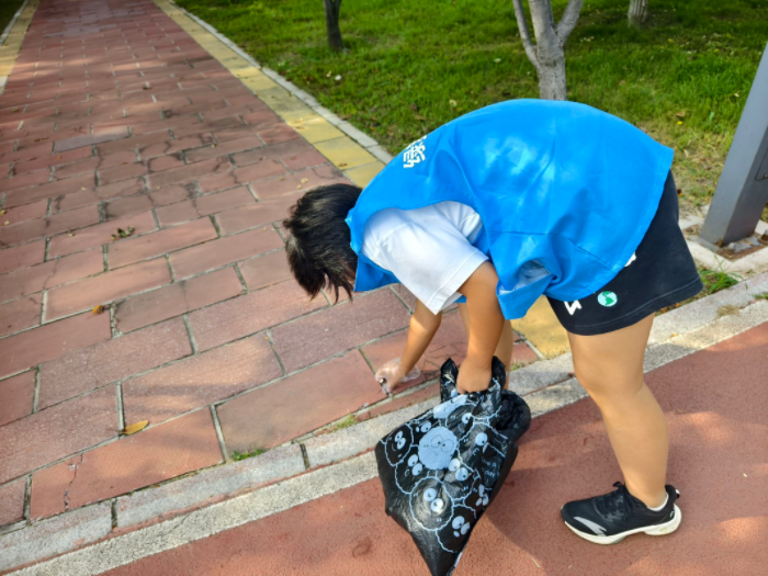 活动中志愿者们身穿蓝色马甲,热情高涨,分工明确,行动有序。认真捡拾公园道路两旁的果皮、纸屑、矿泉水瓶、塑料袋、烟蒂等垃圾,放进随身携带的垃圾袋里。