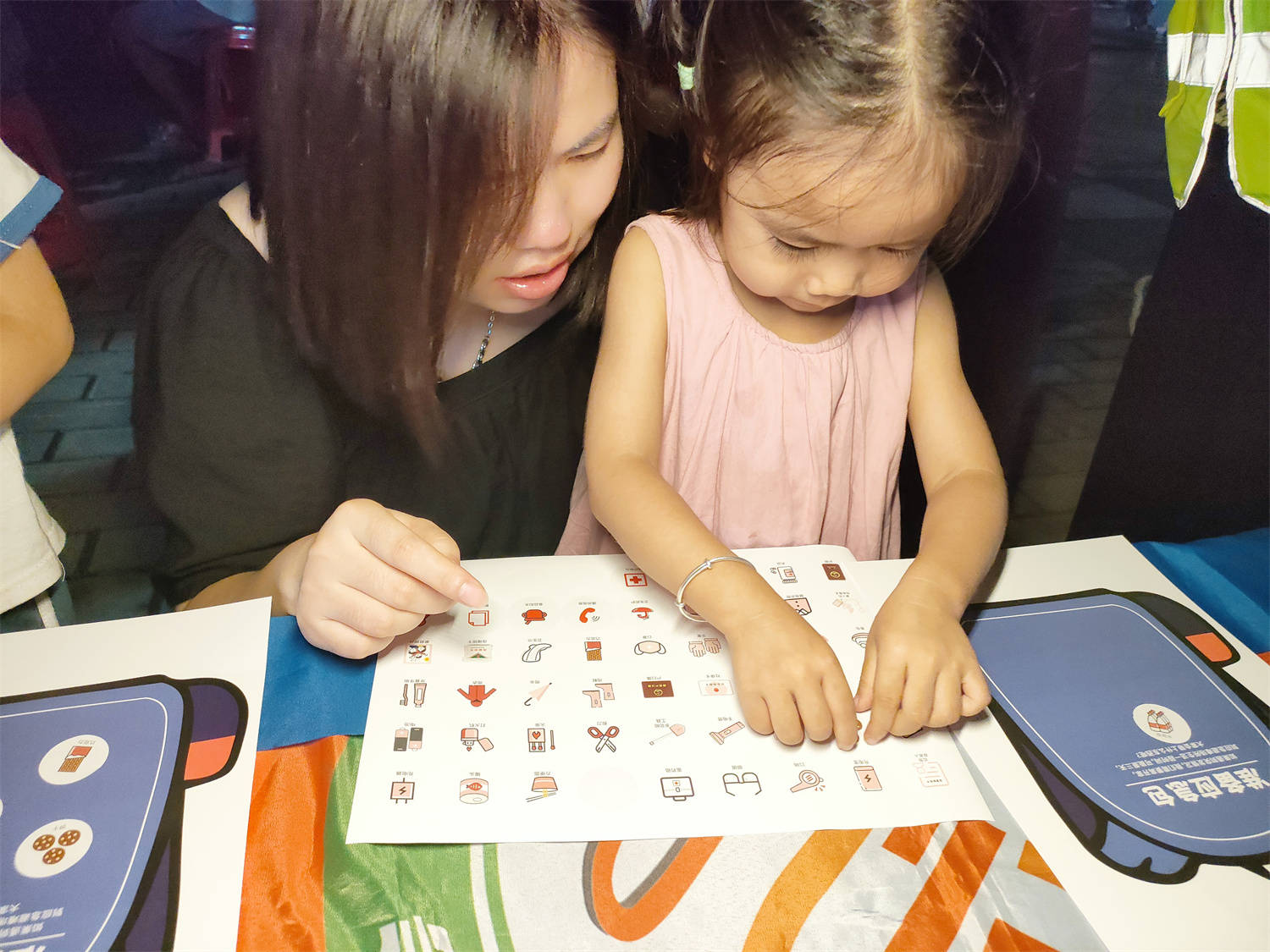“那我们如果出去避难,应该带上什么东西呢,应急包中的物品分为六大类,分别是特殊用品、急救用品、卫生用品、重要文件、个人药品和生存用品,我们在贴纸上找找看看都有什么是必带的,把贴纸贴到你的应急包中。”之后志愿者们为孩子们分发贴纸和纸质应急包。孩子们开始在自己手里的贴纸里认真的找着,有的小朋友贴满了整个背包,说“我觉得都有用”,有的在精挑细选必要的生活物资。