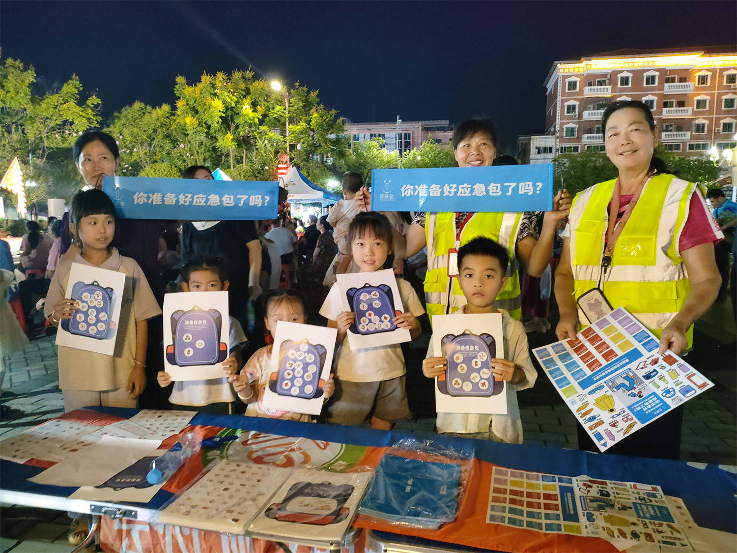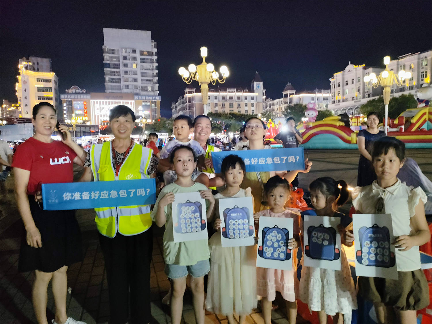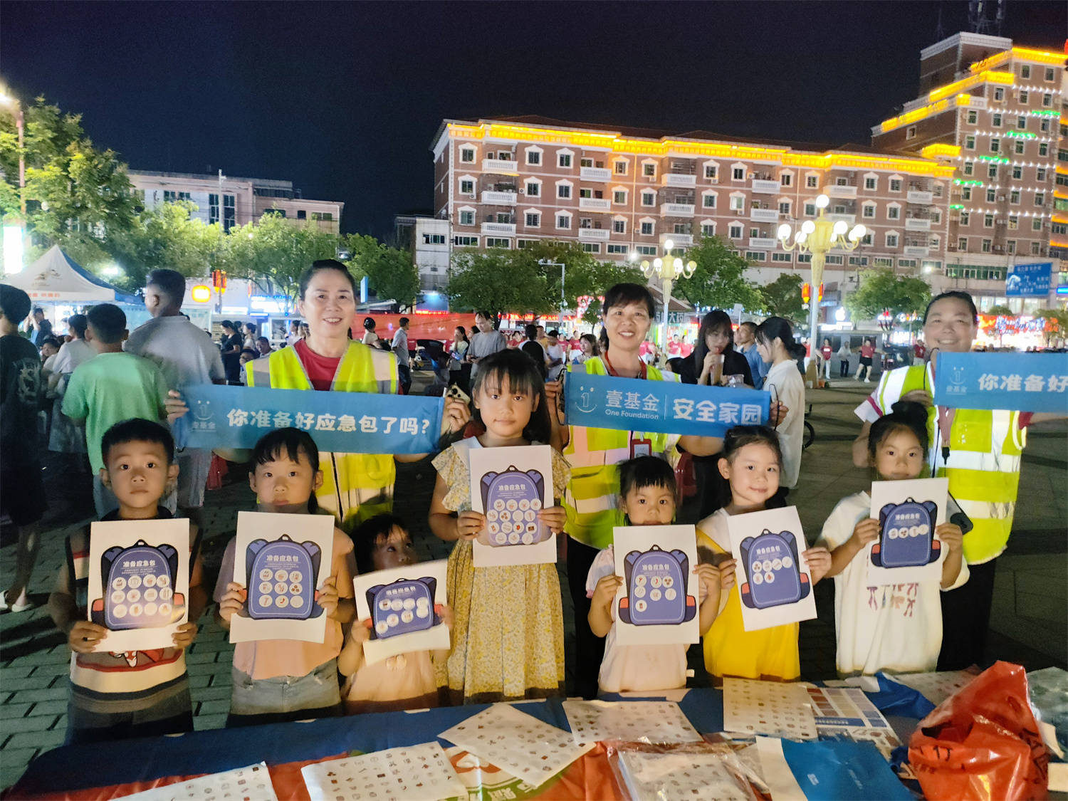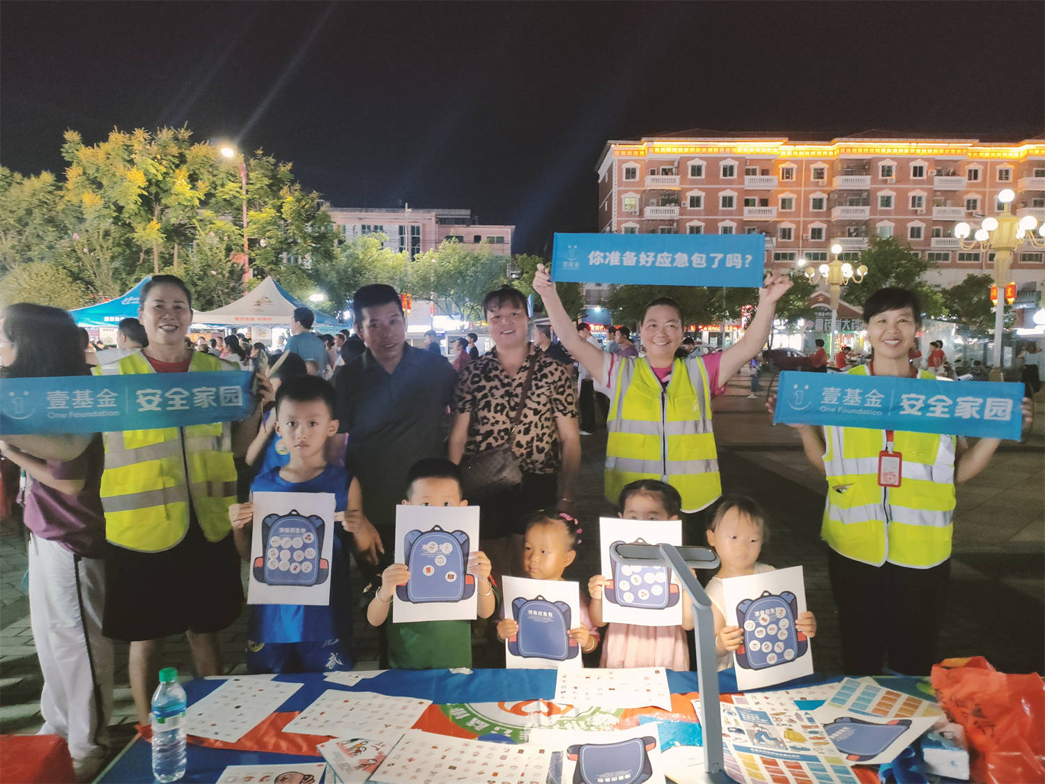 最美开学季,新学期新气象。8月30日晚,在阿里巴巴爱心网友和壹基金的支持下,壹基金安全家园计划伙伴瑞金赋能公益志愿者吴志锋、杨美珍、刘小华、刘颖、刘慧英、朱美萍等一同来到红都广场参与“安平同行 守护开学季”主题活动中,围绕“你准备好了应急包吗?”主题,向公众传播基础应急知识,普及应急包的重要性以及应急物资准备清单,提升灾害风险防范意识和能力。