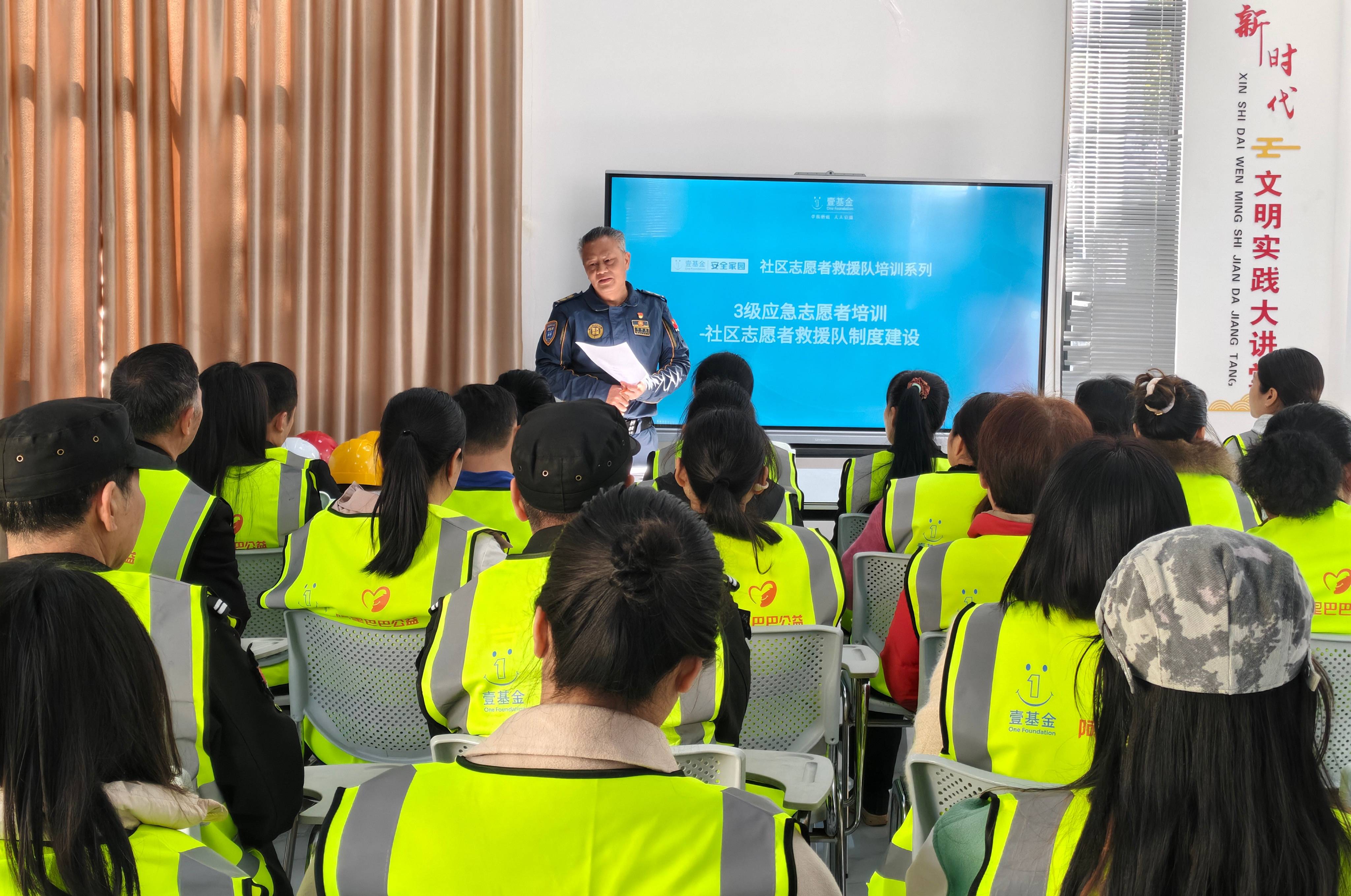 19日下午,在思源社区成立仪式上,现场气氛热烈,居民们热情高涨,早早来到现场。活动伊始,刘海昌教官详细介绍了“壹基金安全家园”项目的背景、目标和意义。他指出,壹基金安全家园项目旨在通过社区志愿者救援队伍的建设,提升社区的应急响应能力,增强居民的安全意识和自我防护能力。刘海昌教官通过分享自己的亲身经历,讲述了在一次突发灾害中,由于缺乏专业的救援知识和设备,许多居民在灾害中遭受了不必要的伤害。他强调,通过“壹基金安全家园”项目的培训,大家可以掌握基本的自救互救技能,减少灾害带来的损失。刘海昌教官的生动讲解让大家深刻认识到安全培训的重要性,现场气氛热烈,大家纷纷点头表示认同。