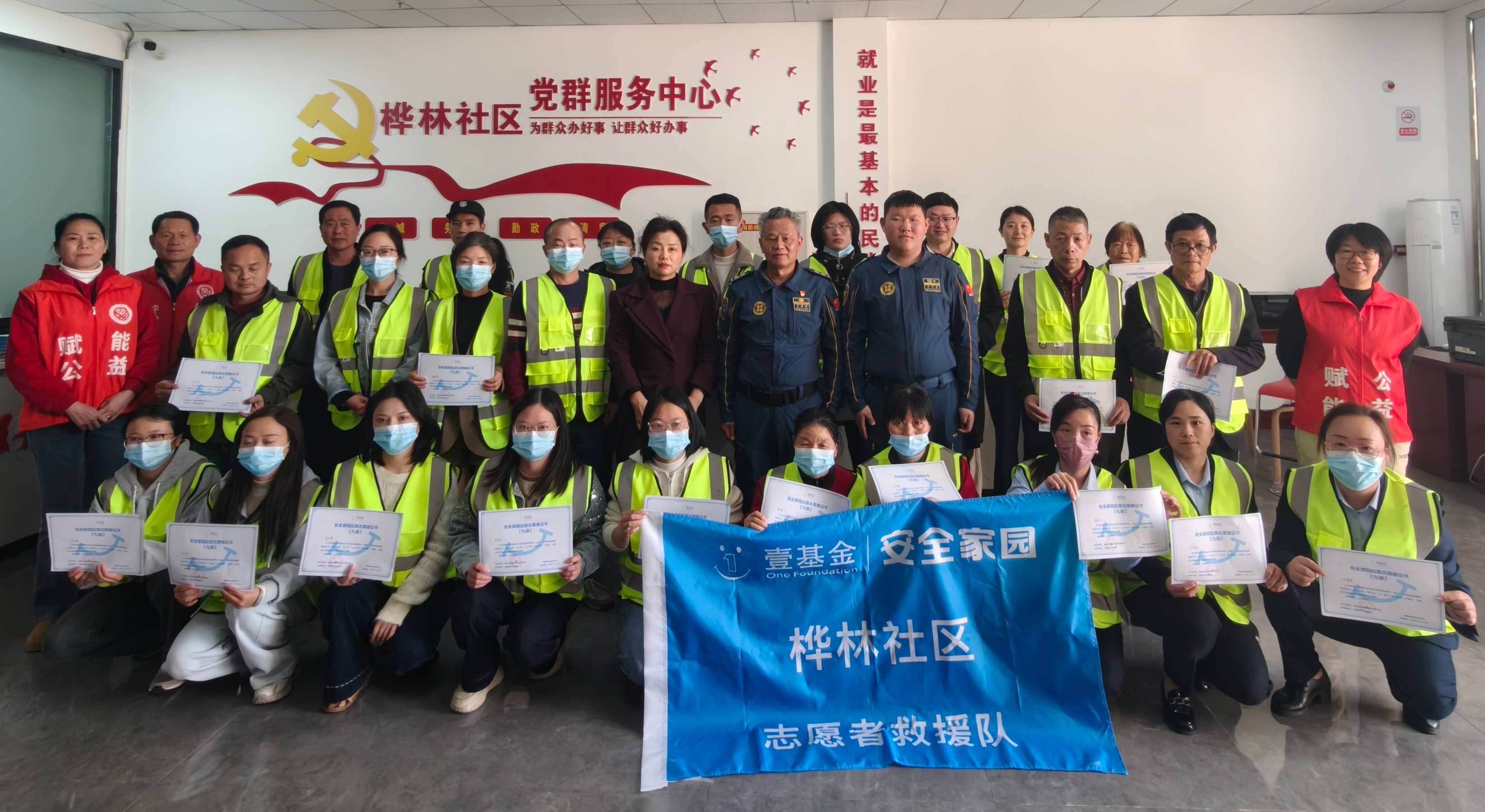 “我志愿加入桦林社区志愿者救援队,志愿为社区居民提供力所能及的救援服务!尽我所能,人人公益……”在桦林社区,大家认真观看安全家园项目宣传片,接着举行了授牌、授旗仪式。在队伍宣誓环节,全体志愿者整齐列队,激昂地朗读誓词。宣誓结束后,队员们进行了社区志愿者救援队制度建设培训,通过队伍章程和器材管理制度等等文件,桦林社区志愿者救援队宣告成立!
