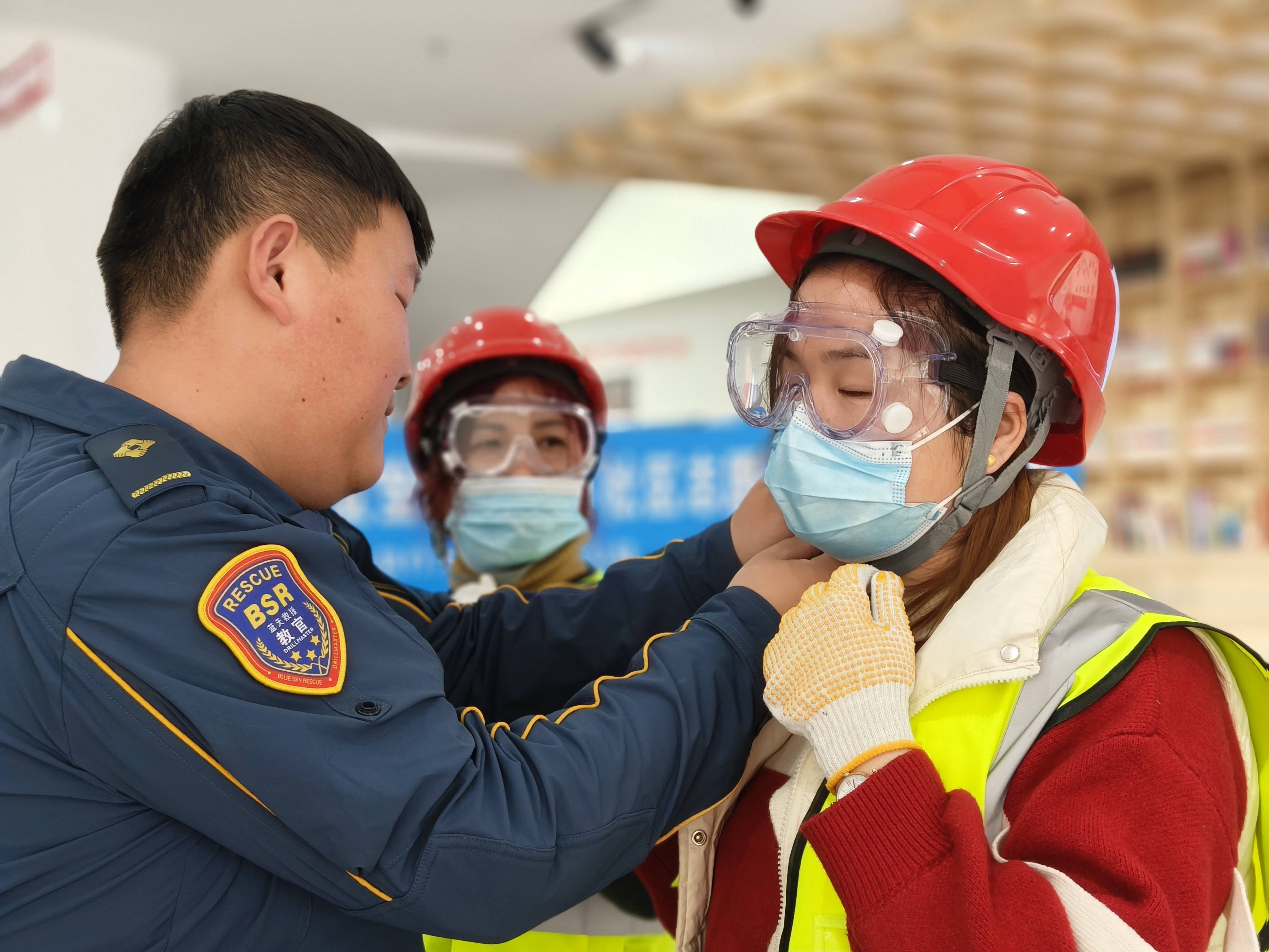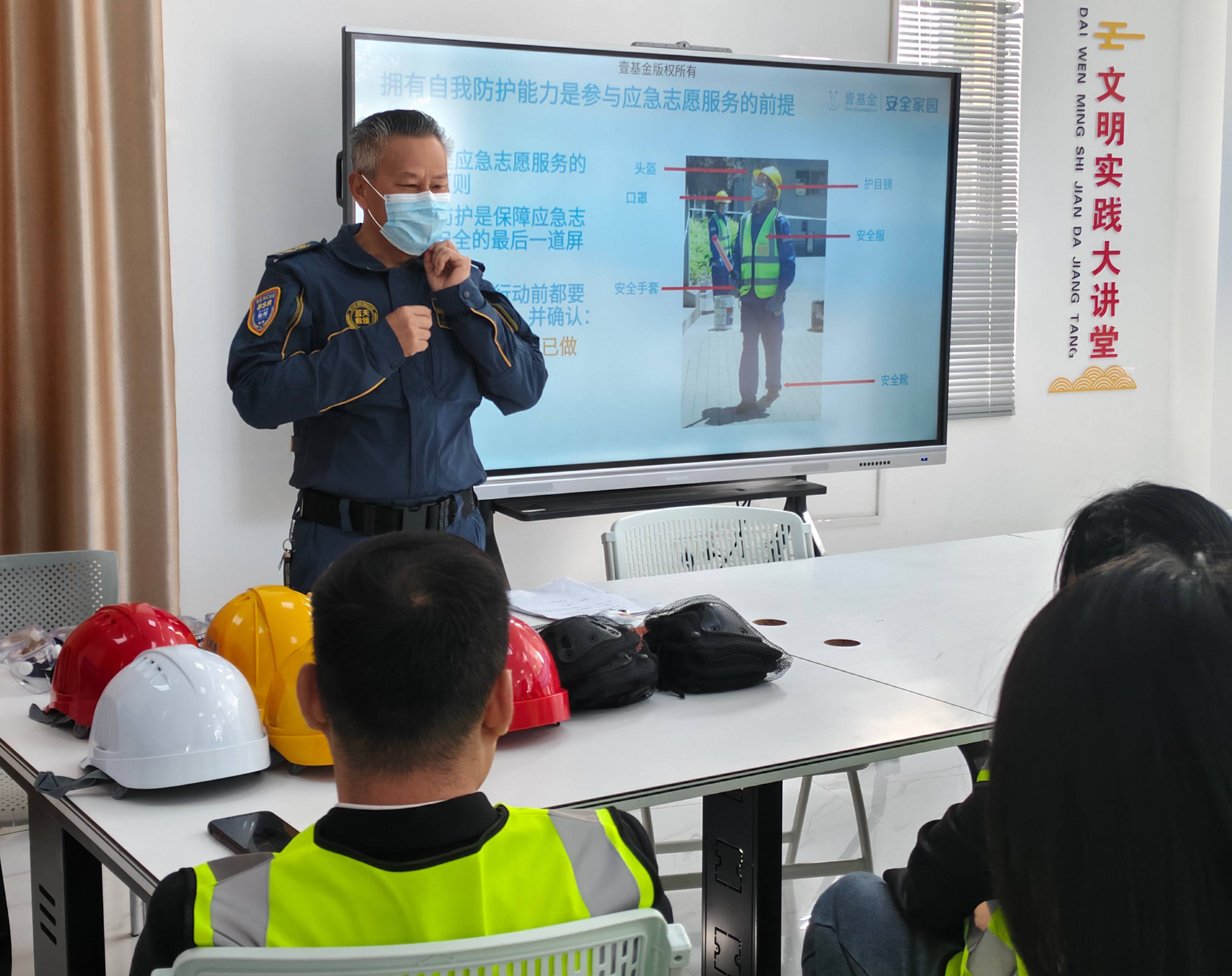 社区是社会的基本单元,其安全状况直接关系到居民的生活质量和幸福感。然而,在面对自然灾害、突发事件时,社区往往存在应急能力不足的问题。在九天社区自我防护培训环节,刘海昌教官一边演示一边讲解护具的作用,包括口罩、手套、护目镜、安全头盔等。他特别强调,在面对紧急情况时,必须先保证自身安全,才能对他人进行救援。演示结束后,刘海昌教官邀请大家上台实操演示,大家踊跃参与。但在展示过程中,有人不知道如何调节安全头盔。刘海昌教官立即重新演示了一遍,并详细讲解了调节方法和注意事项。通过这次实操演示,参与人员更加熟练地掌握了护具的使用方法。