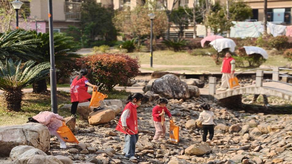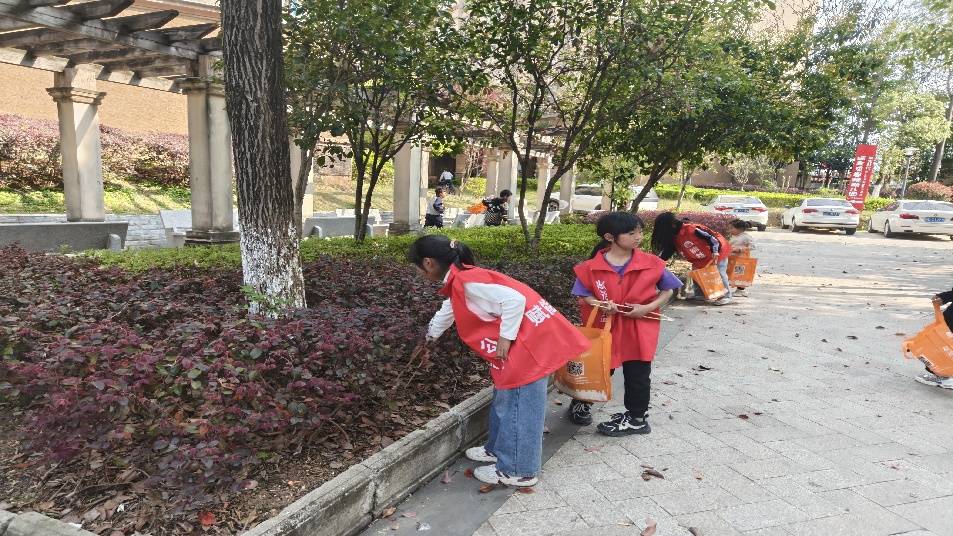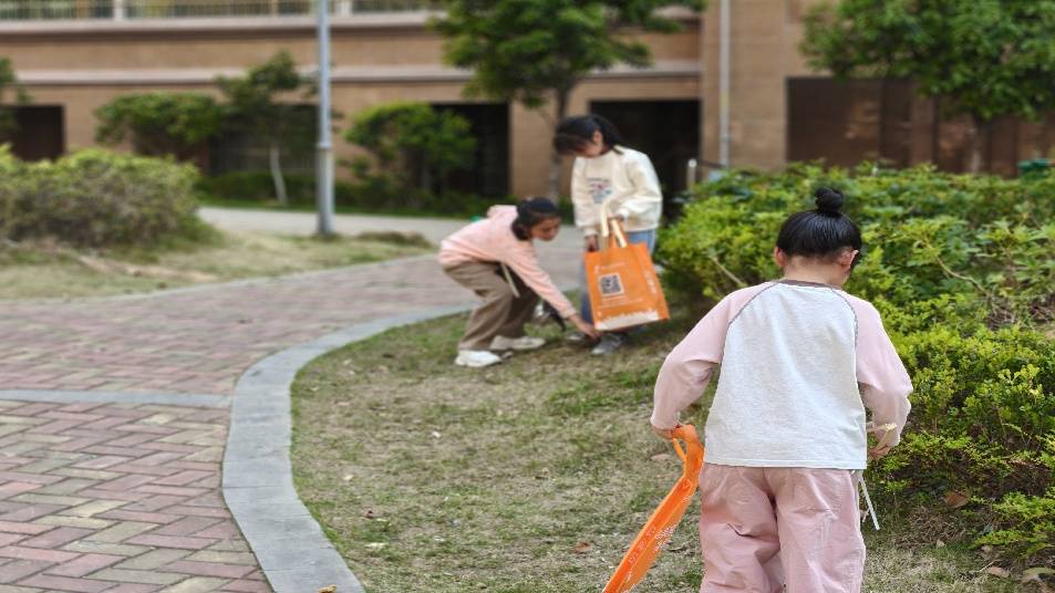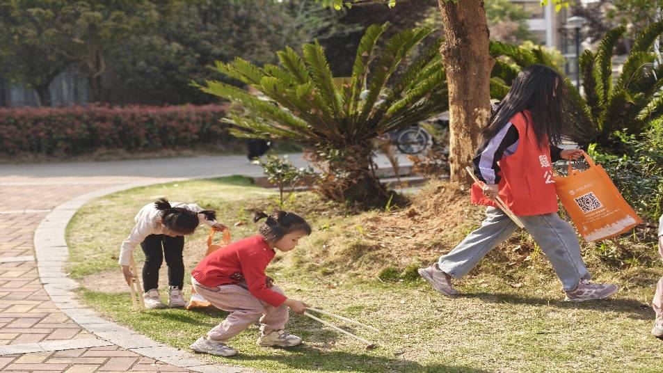 活动开始前,小朋友们拿着装备排队往小区内走去。一路上孩子们化身“社区小卫士”,手持夹子、环保袋,分组清理小区内道路、绿化带及小区公园里散落的垃圾。