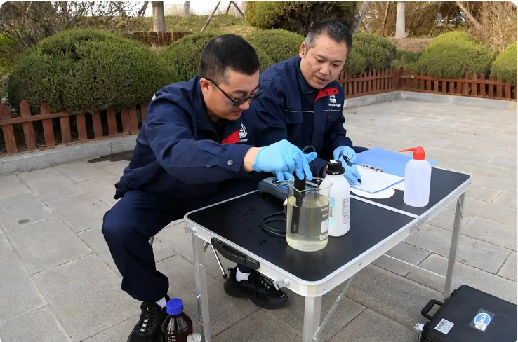 4月22日,在锦州大凌河口湿地,当地环保部门工作人员检测湿地水质。新华社记者 马宁 摄