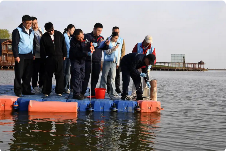 4月22日,在锦州大凌河口湿地,嘉宾观摩当地环保部门工作人员取样检测湿地水质。新华社记者 马宁 摄