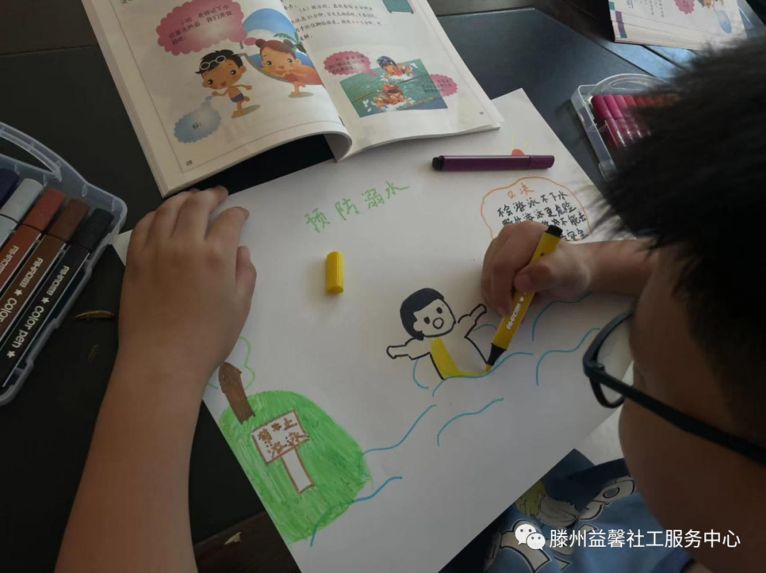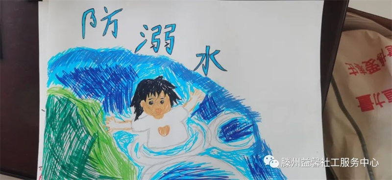 孩子们认真地勾画出了一幅幅防溺水绘画作品,从不同角度展示了防溺水和珍爱生命的主题, 让困境儿童掌握了防溺水安全知识,增强了安全防范意识。