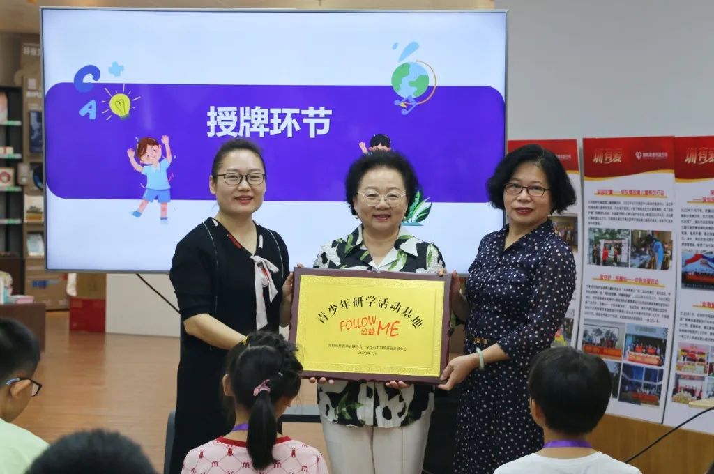 活动现场,与会领导嘉宾为深圳市华强公益基金会华强公益空间授予“公益FOLLOW ME”青少年研学活动基地牌匾,并与研学活动学员们合影留念。